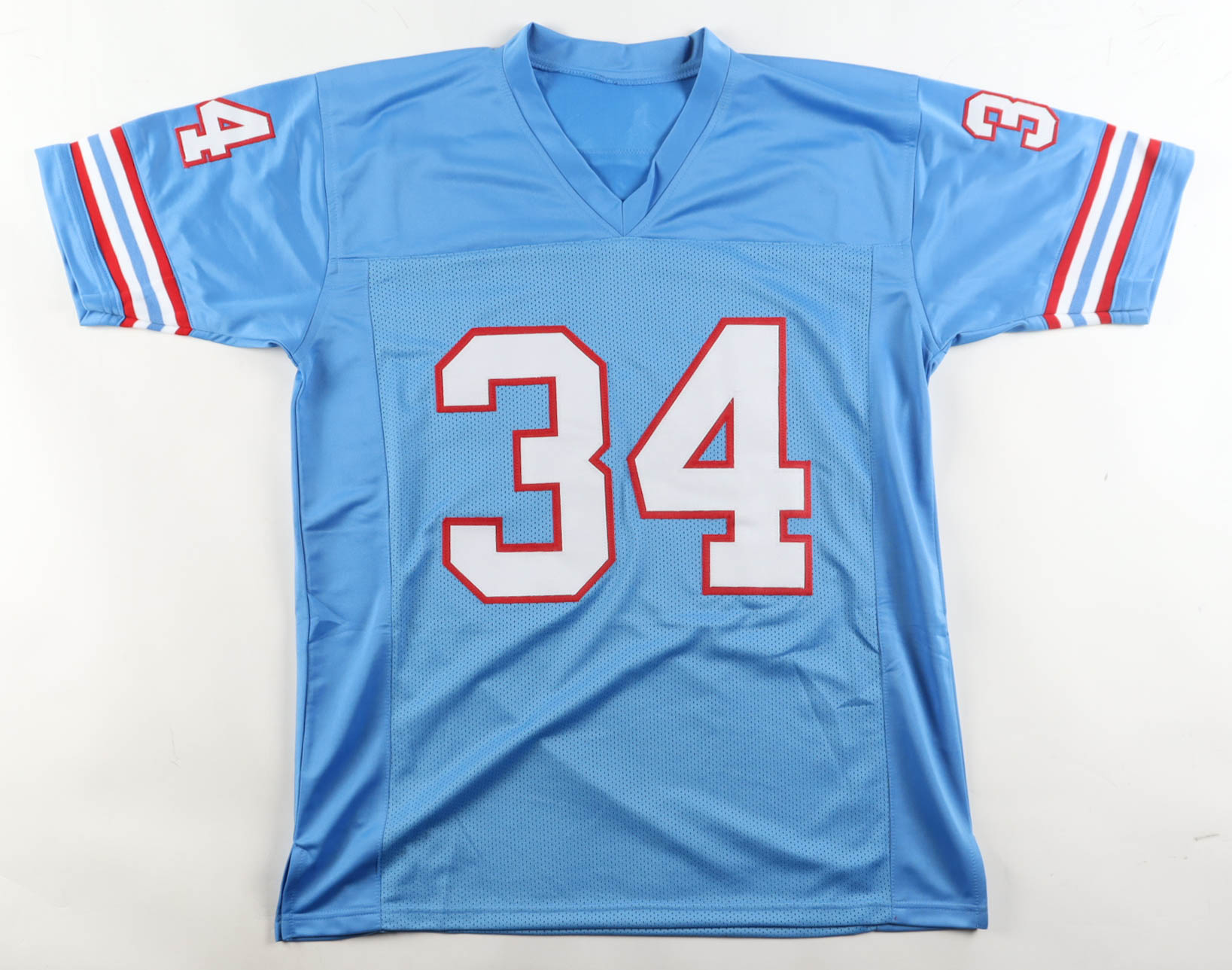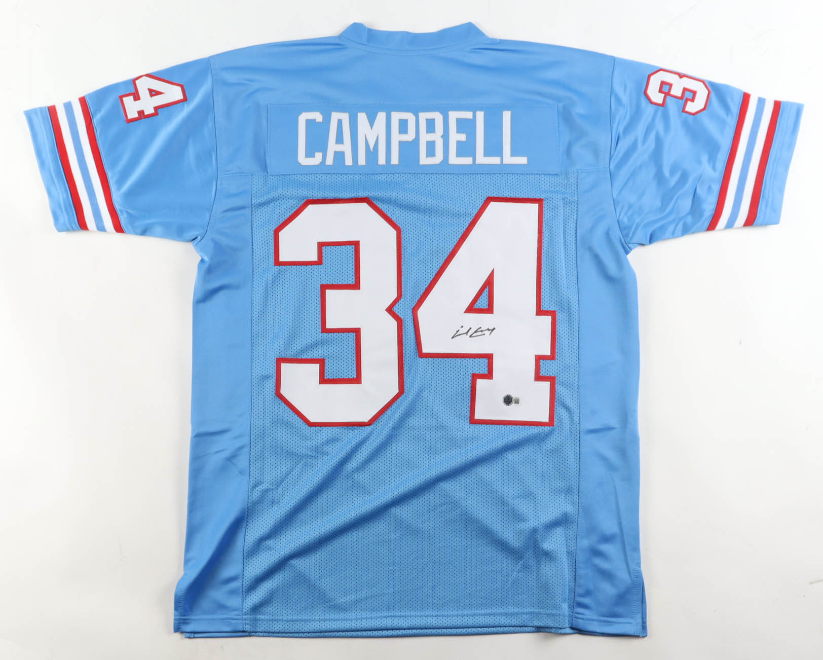 Custom jersey with everything sewn on, size XL. Hand-signed by Earl Campbell (HOF).