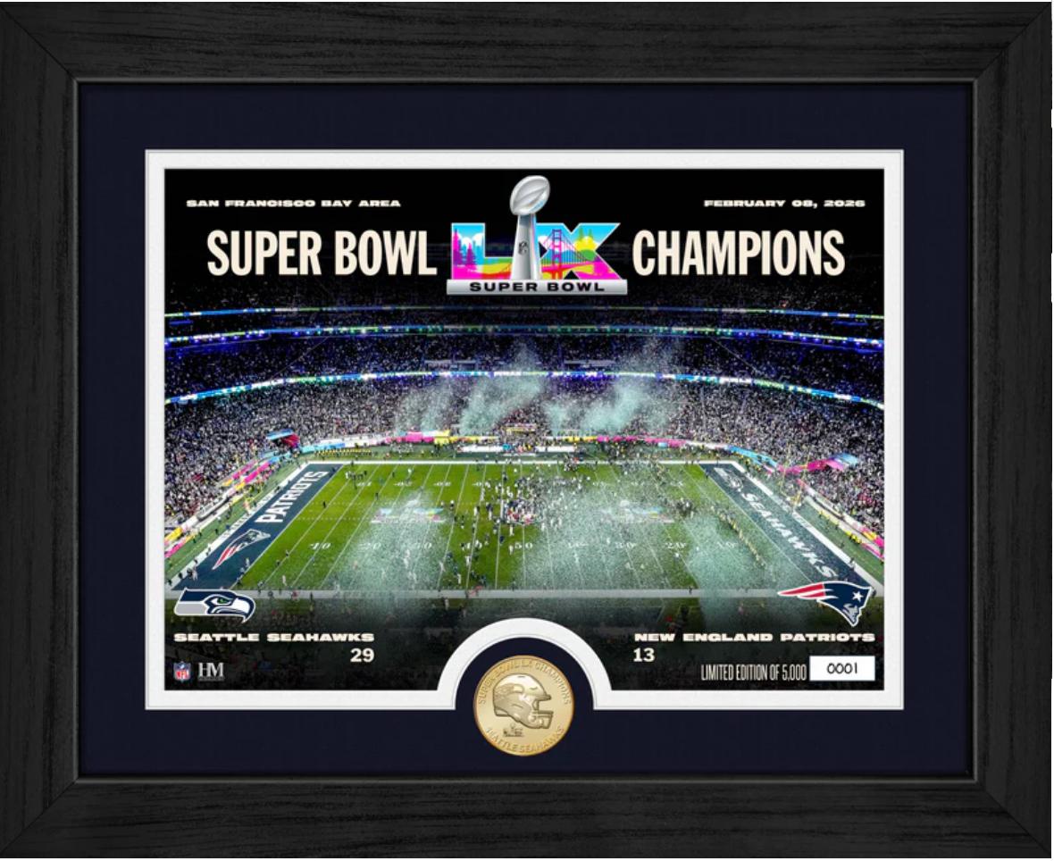 Custom frame measures 13" x 16" in size and features in double matting under glass a commemorative print of the Super Bowl LVIIII Champions, the Seattle Seahawks! Display also features a bronze coin.