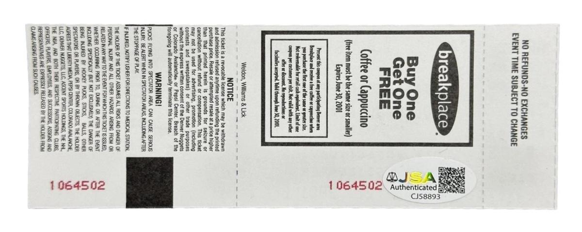 Joe Sakic Signed Avalanche 2001 Stanley Cup Game 2 Ticket (JSA)