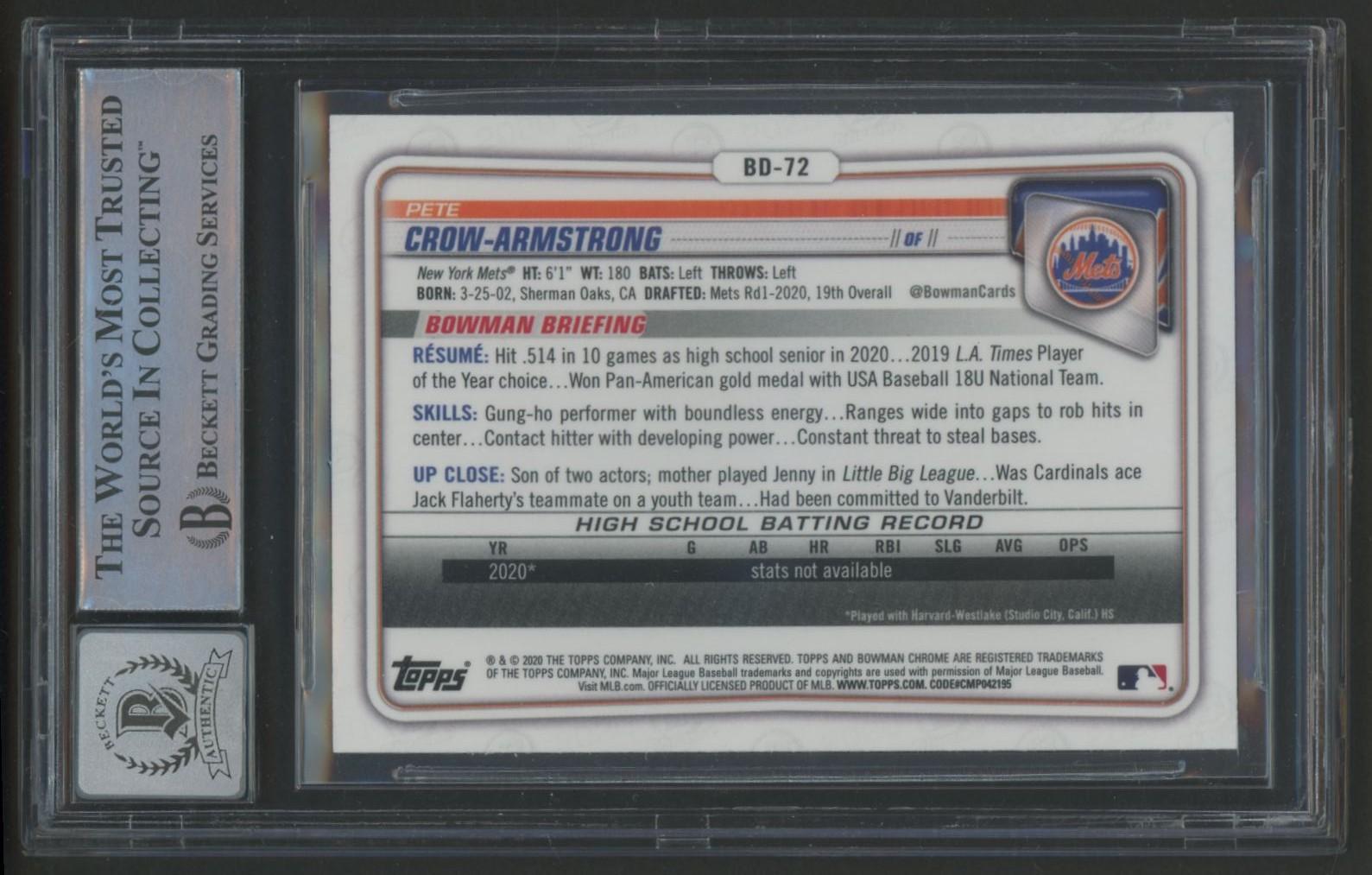 Pete Crow-Armstrong Signed 2020 Bowman Chrome Draft #BD72 RC (BGS | Auto 10)