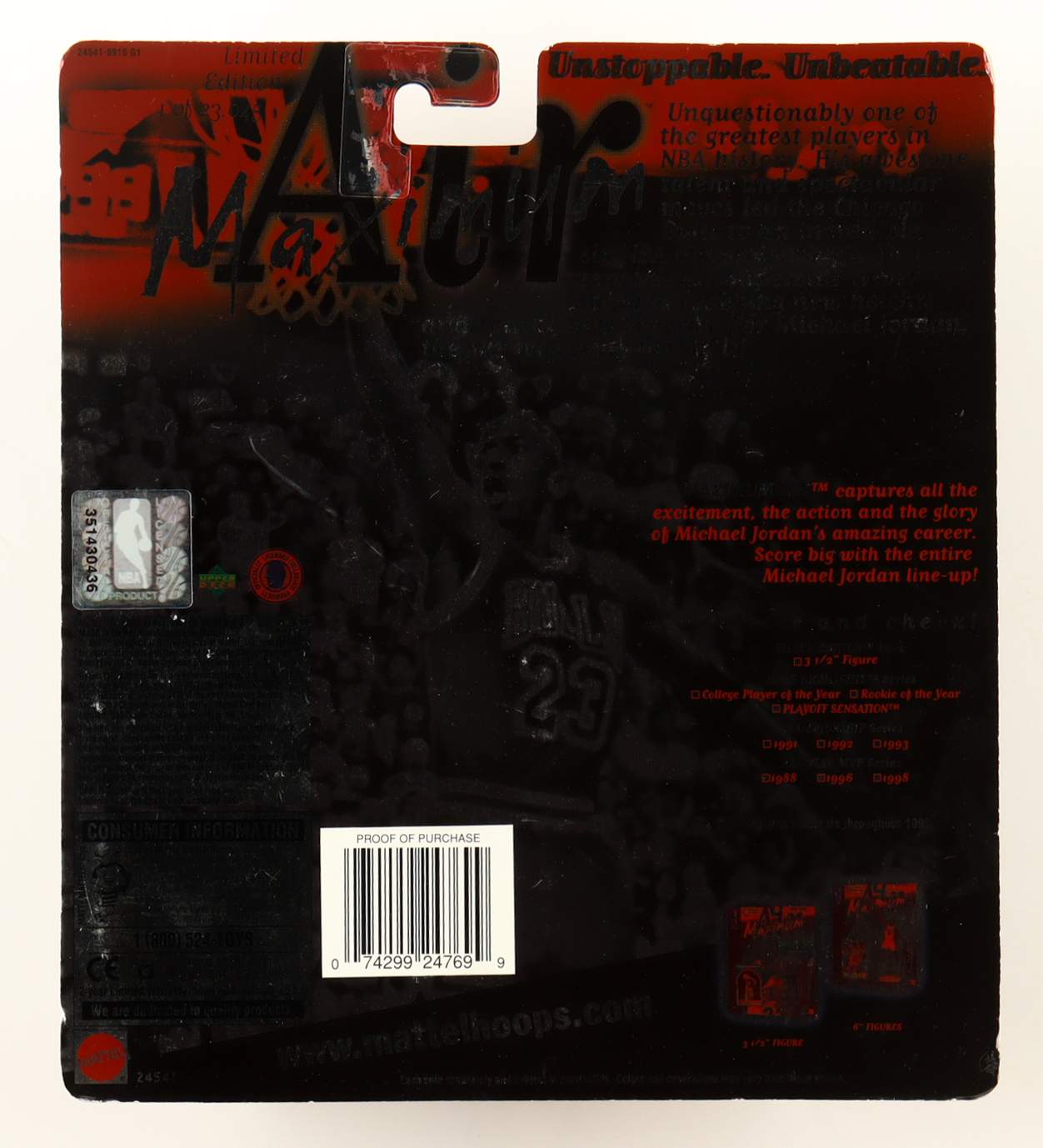 Mattel Michael Jordan Chicago Bulls 1999 Maximum Air Hoop Highlights Rookie of the Year Series Commemorative action figure measures approximately 6" in height. Action figure includes an Upper Deck basketball card and comes in the original packaging as shown. Figure is limited edition # / 23,045. Please note the packaging window is not fully glued down.