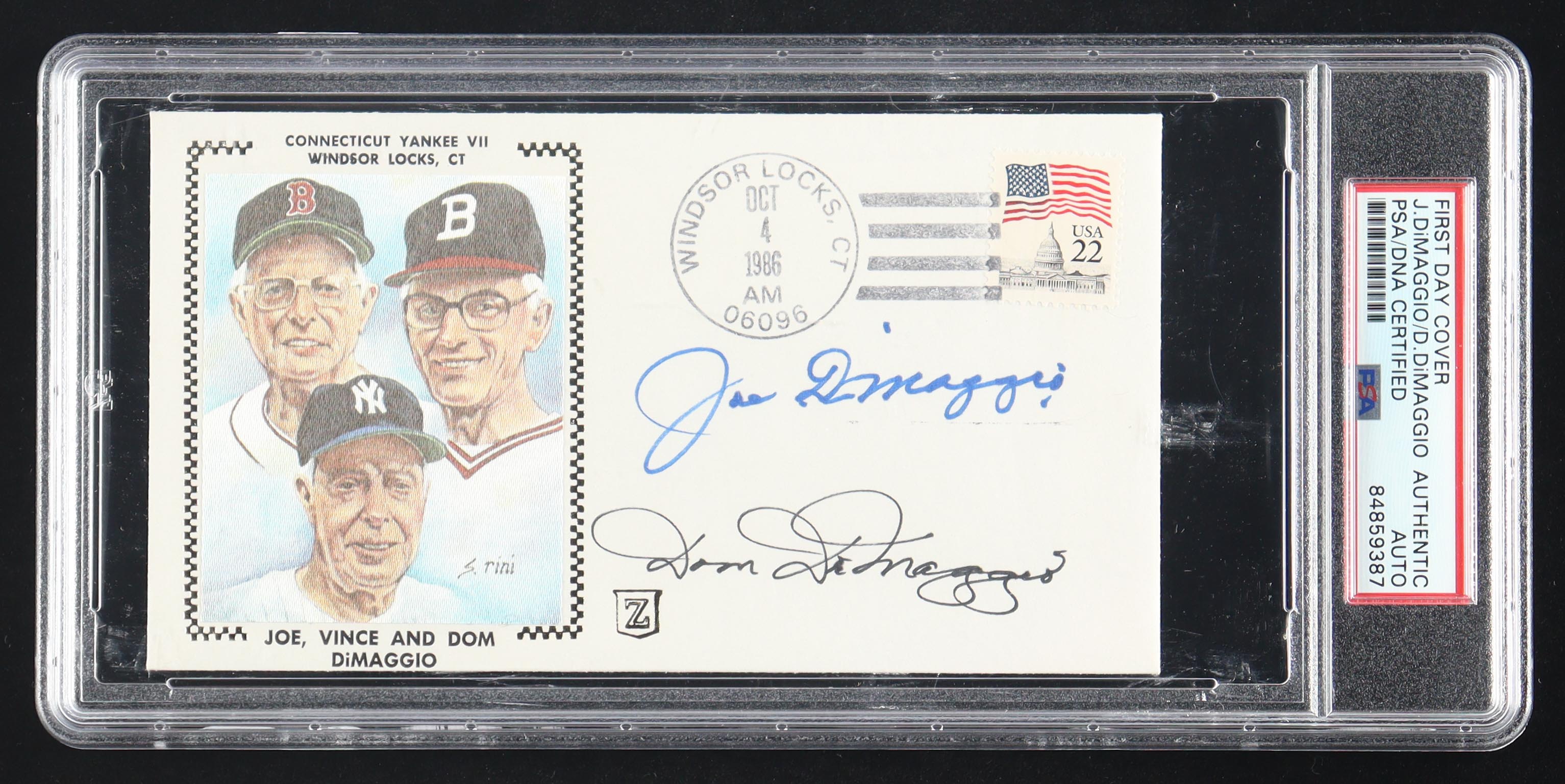1986 Connecticut Yankee VII FDC Envelope. Hand-signed by Joe DiMaggio (D. 1999, New York Yankees, HOF) and Dom DiMaggio (D. 2009, Boston Red Sox).