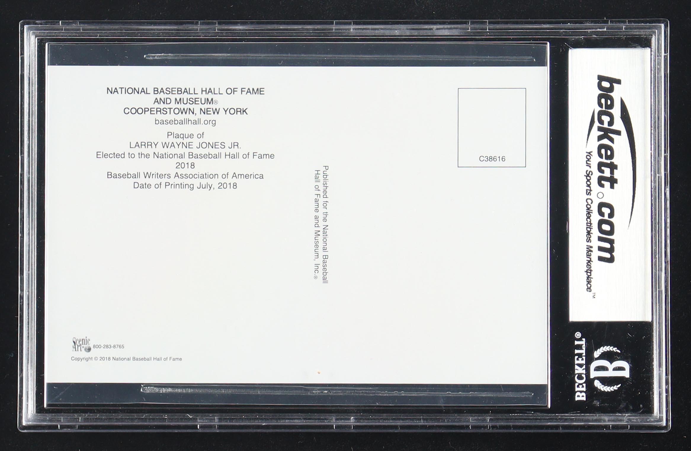 National Baseball Hall of Fame postcard features a cut that features a hand-signed by Chipper Jones (Atlanta Braves, HOF). Please note that the autograph has been graded (BGS) 10.