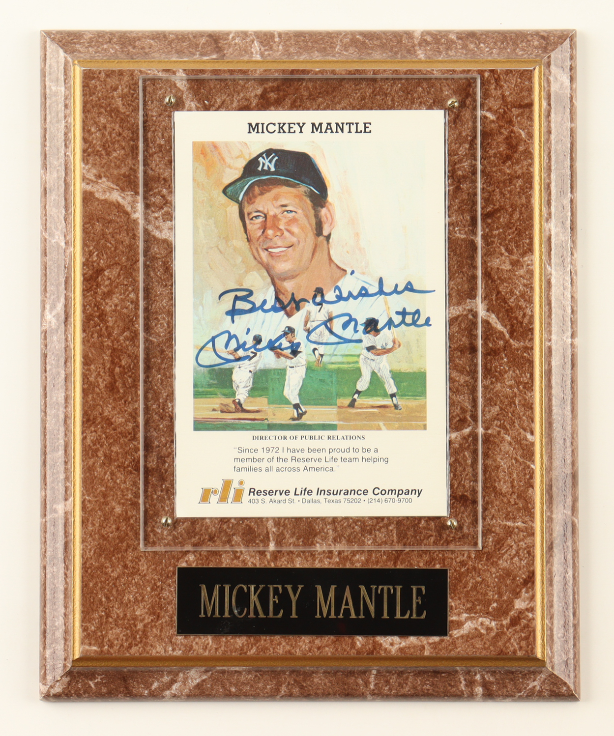 Custom plaque measures 8" x 10" in size. Reserve Life Insurance promo card is hand-signed and inscribed by Mickey Mantle (d. 1995, New York Yankees, HOF). Display also includes a nameplate.
