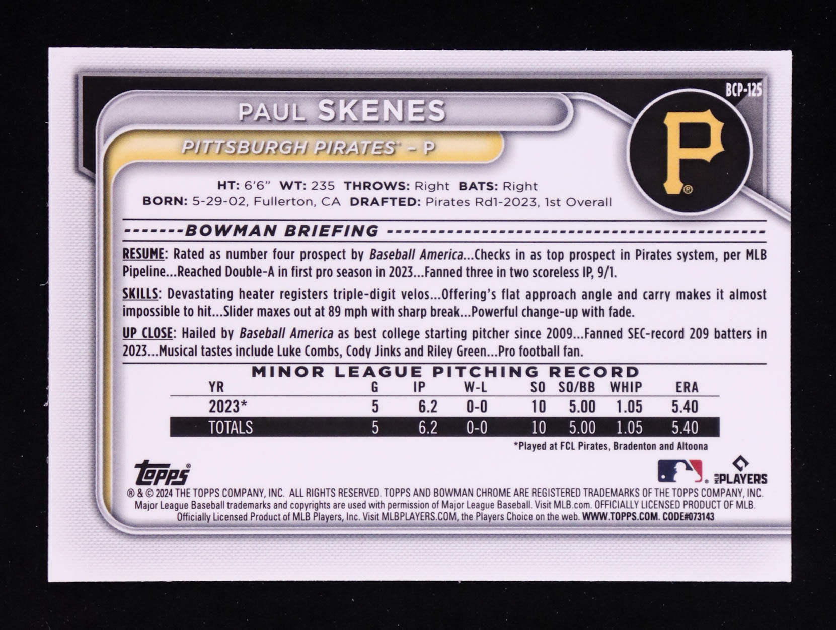 Paul Skenes 2024 Bowman Chrome Prospects Lunar Glow Refractors #BCP125 RC