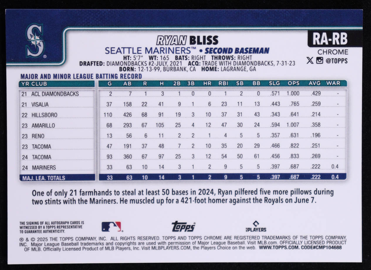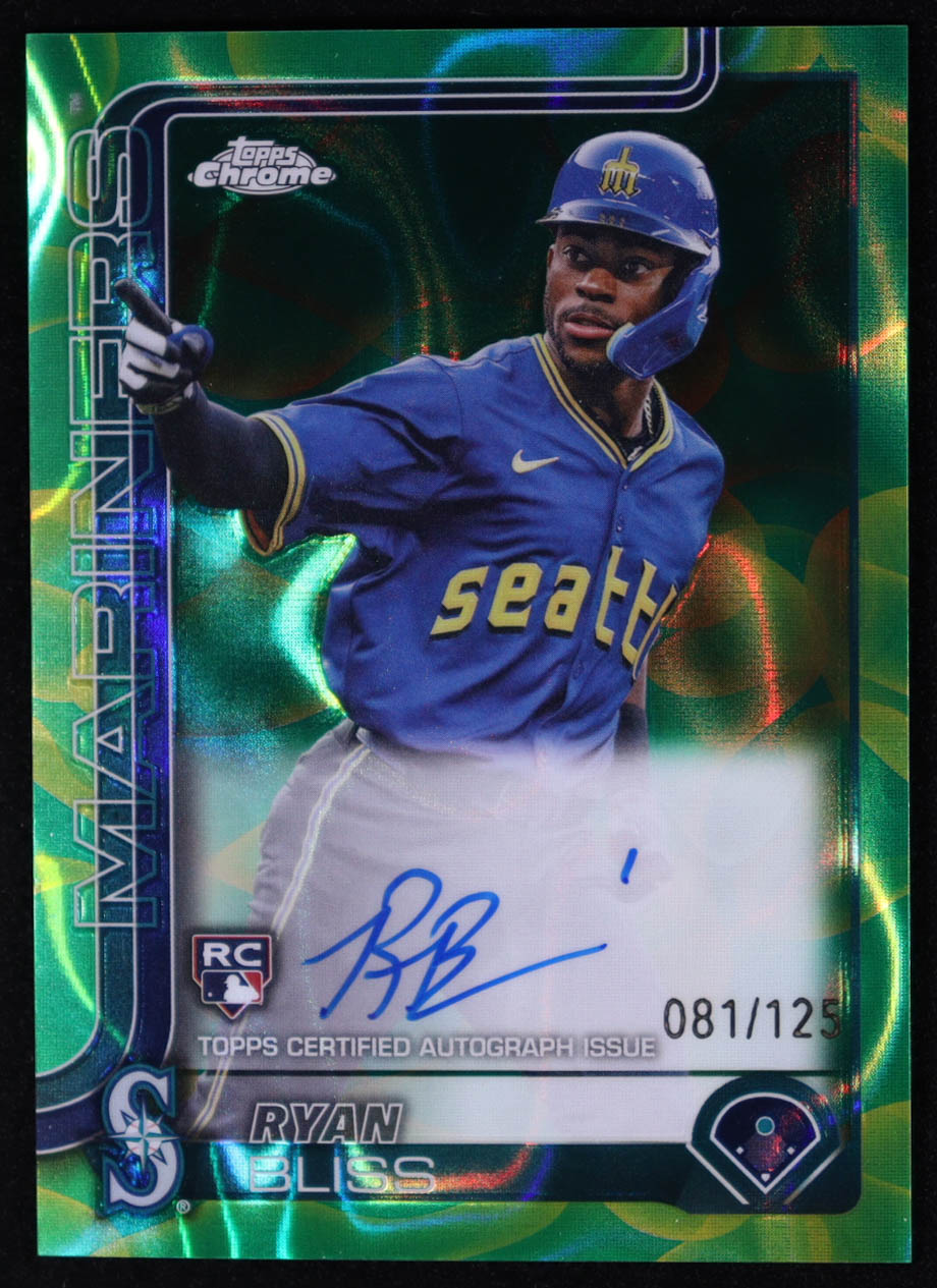 Ryan Bliss 2025 Topps Chrome Update Rookie Autographs Green Yellow Lava Lamp Refractors #RARB #081/125 RC