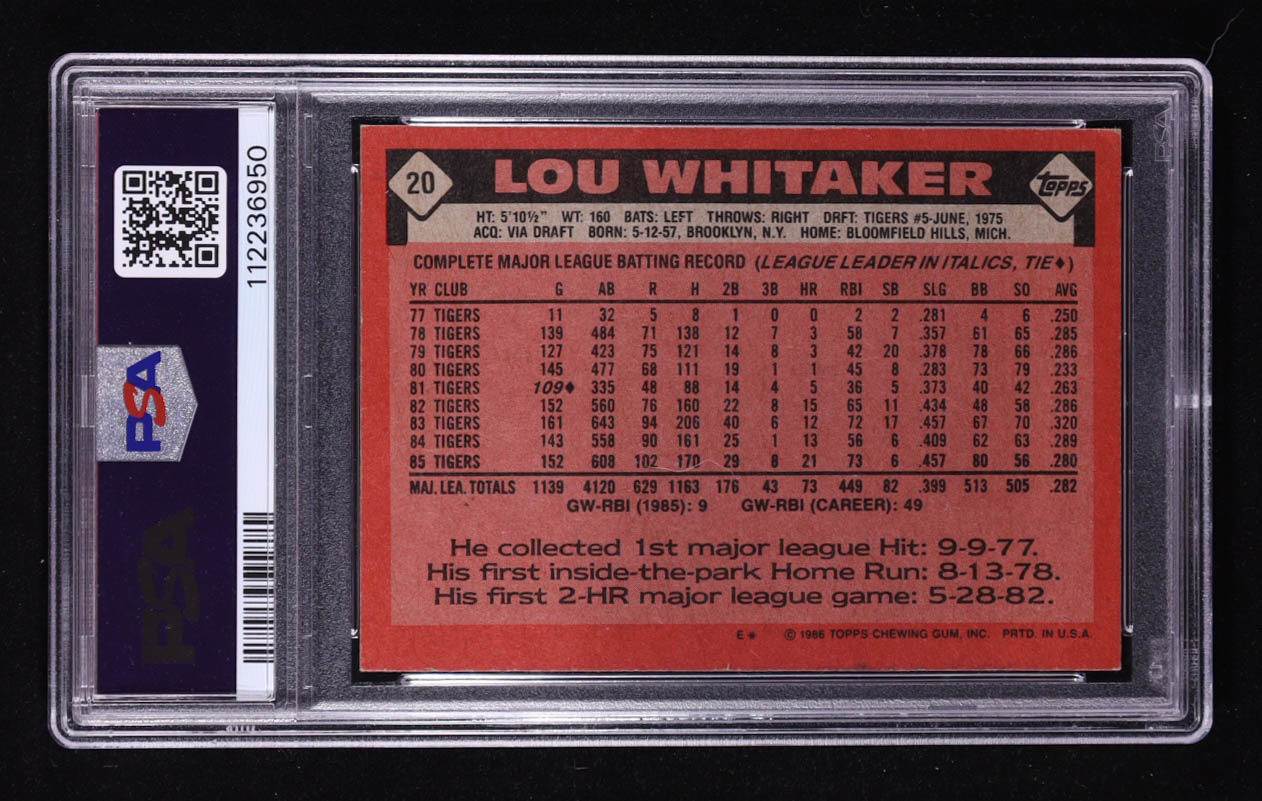 Lou "Sweet Lou" Whitaker Signed 1986 Topps #20 (PSA 4)