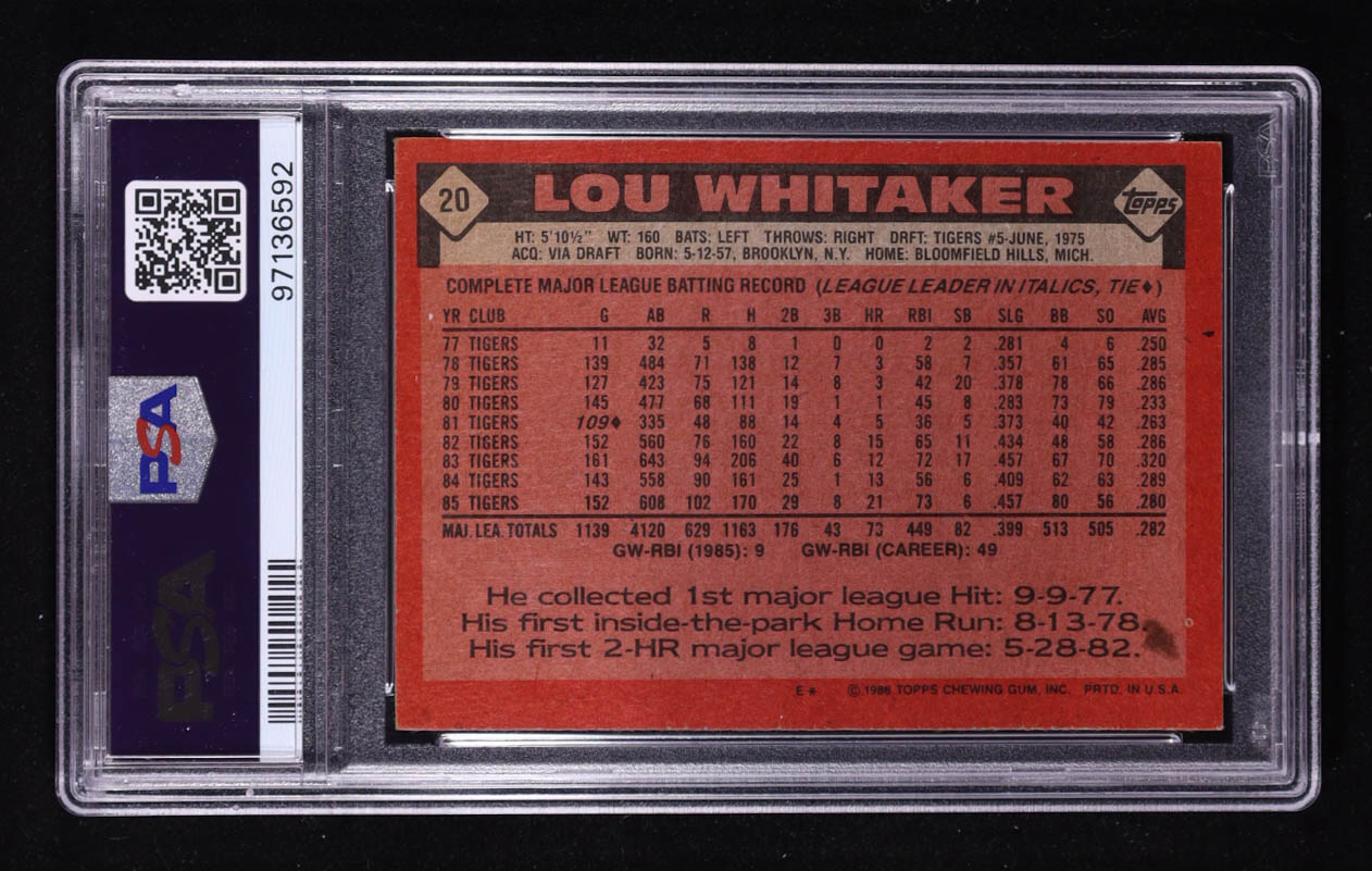 Lou Whitaker Signed 1986 Topps #20 (PSA 6)