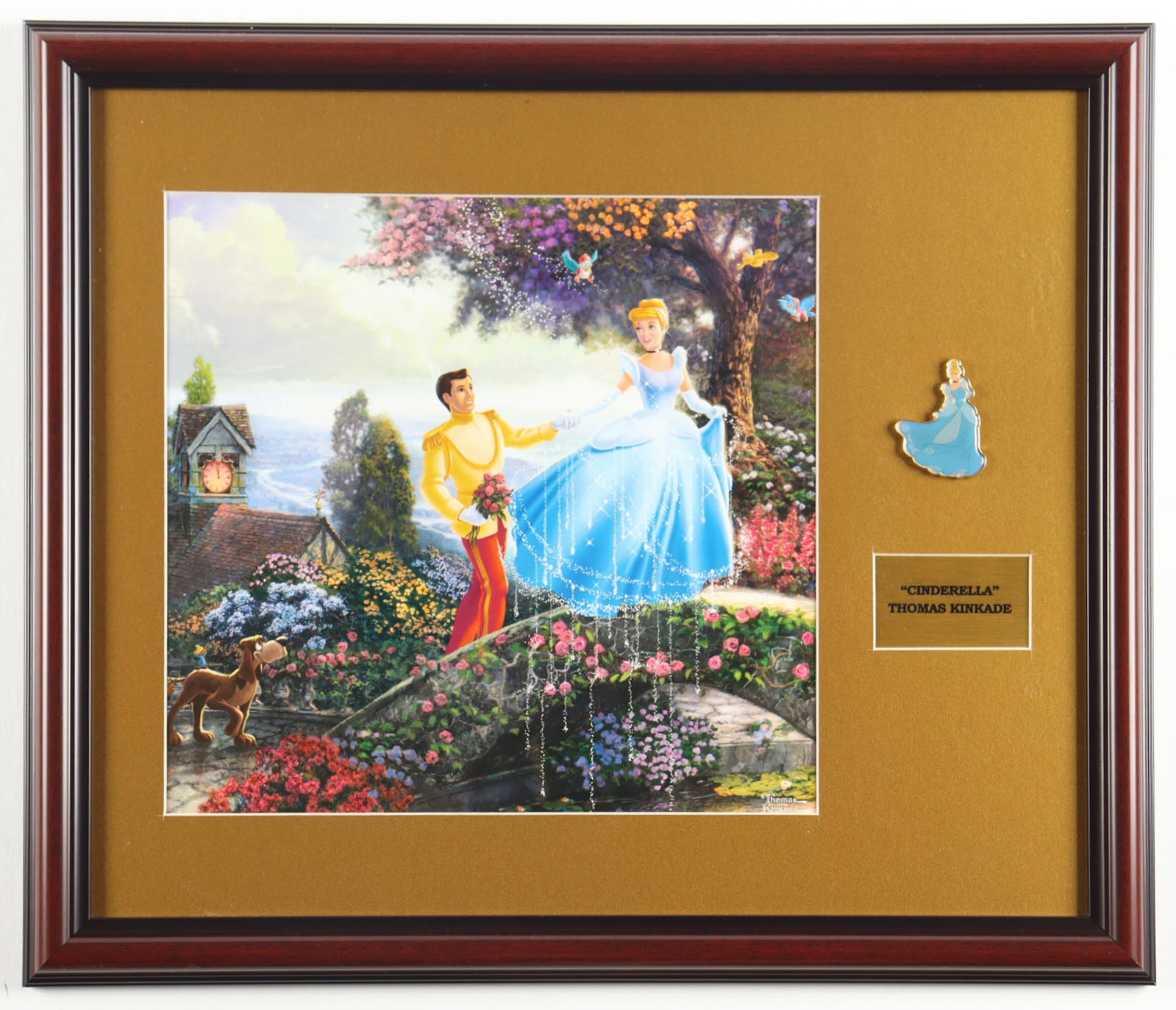 Custom frame measures approximately 17" x 20" in size and features a print of "Cinderella" by Thomas Kinkade (D. 2012). The display also features a matching Cinderella pin. Please note, the display is unsigned.