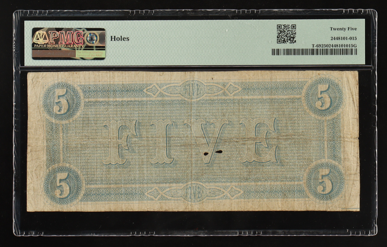 1864 Confederate States of America - $5 Currency Note T-69 (PMG VF25)