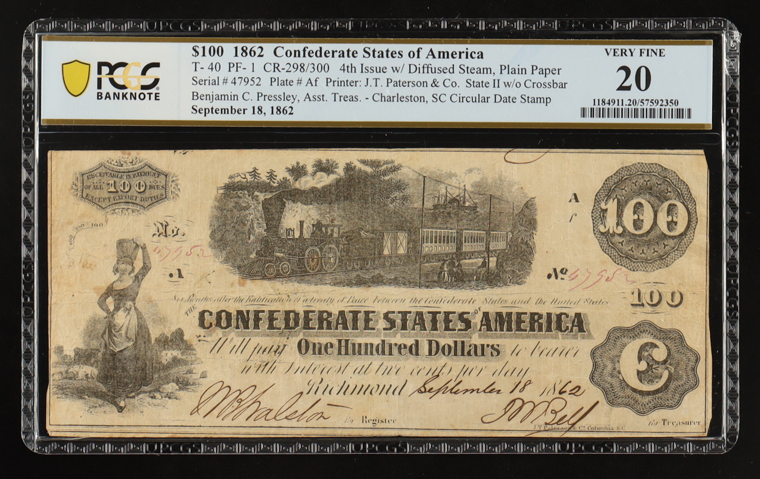 1862 Confederate $100 Currency Note, T-40 4th Series - Signed: Benjamin C. Pressley Asst. Treasurer w/ Charleston, SC Date Stamp (PCGS Very Fine 20)