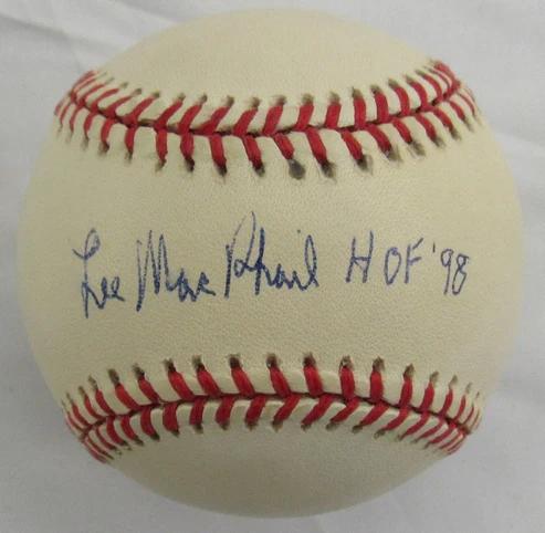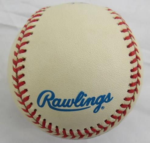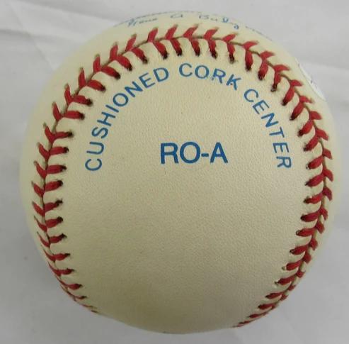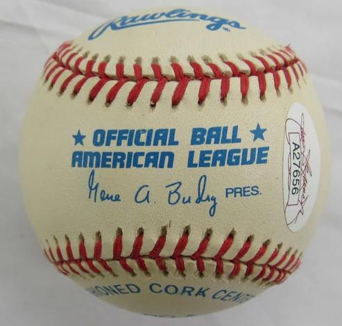 Rawlings Official American League Baseball. Hand-signed by Lee MacPhail (D. 2012, HOF). Please note, the baseball is naturally toning and stained.