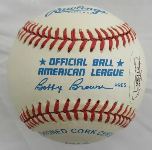 Rawlings Official American League Baseball. Hand-signed by Early Wynn (D. 1999, Cleveland Indians, HOF). Please note, the baseball is naturally toning and stained.