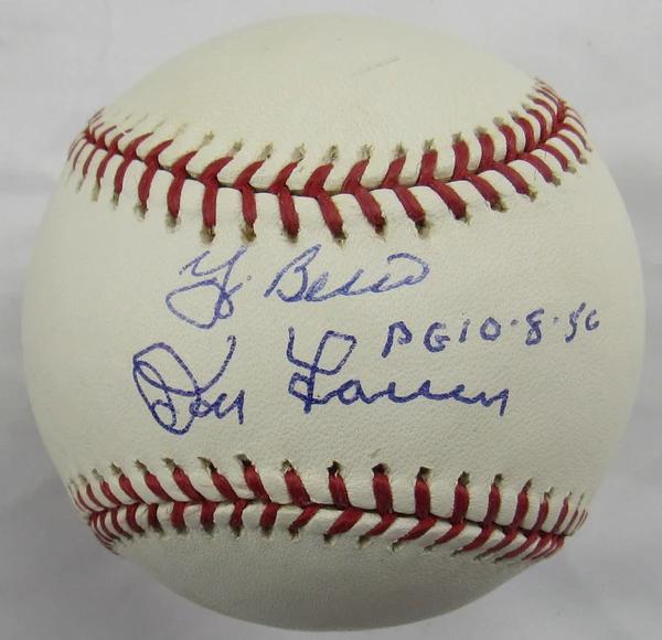 Rawlings Official Major League baseball. Hand-signed and inscribed by Yogi Berra (D. 2015, New York Yankees, HOF) and Don Larsen (D. 2020, New York Yankees).