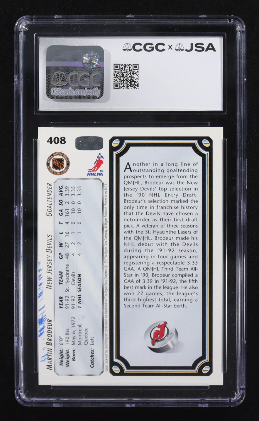 Martin Brodeur Signed 1992-93 Upper Deck Star Rookies #408 RC (CGC | Autograph Graded CGC 10)