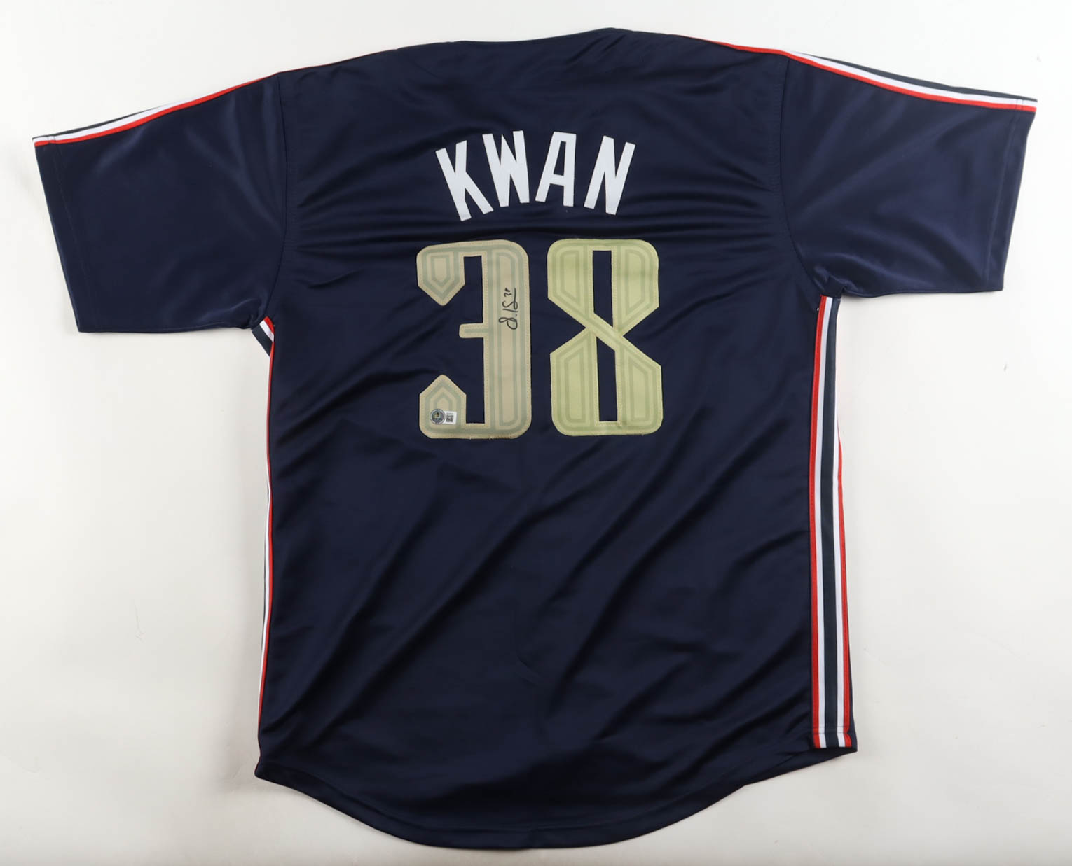 Custom jersey with everything sewn on, size XL. Hand-signed by Steven Kwan.