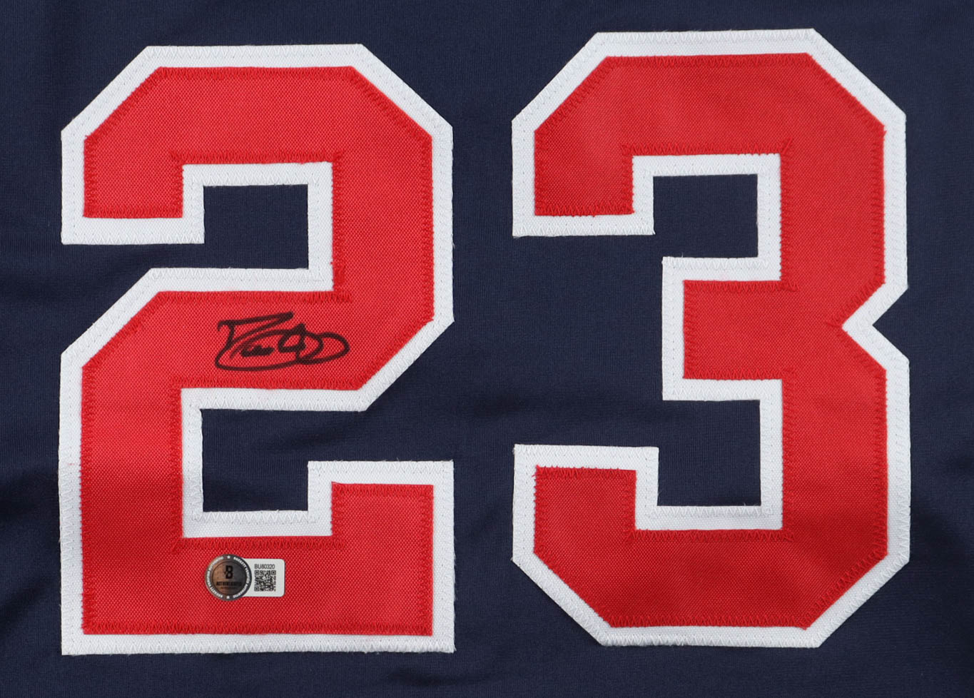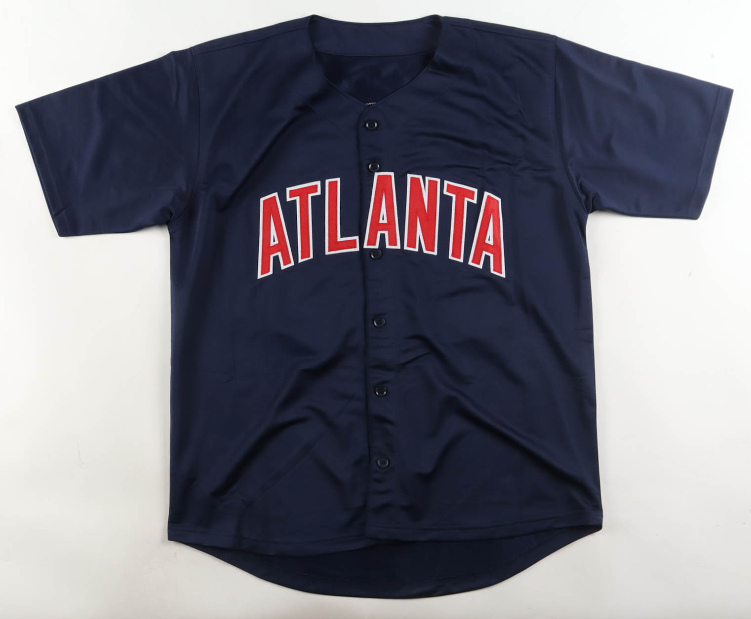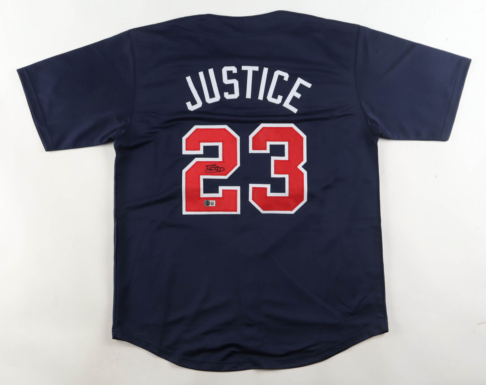 Custom jersey with everything sewn on, size XL. Hand-signed by David Justice.