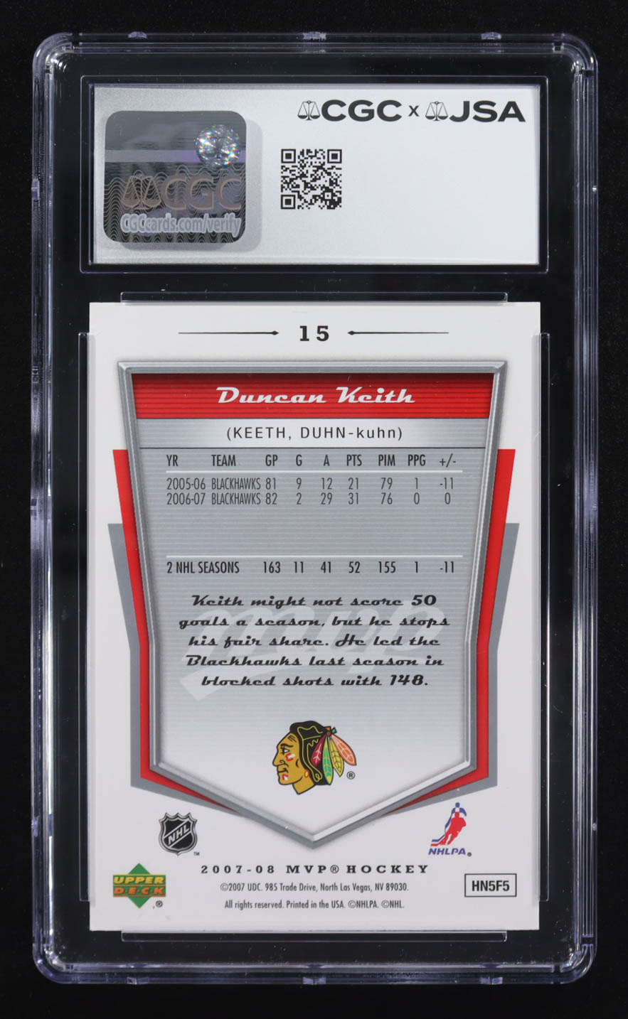 Duncan Keith Signed 2007-08 Upper Deck MVP #15 (CGC | Autograph Graded CGC 10)