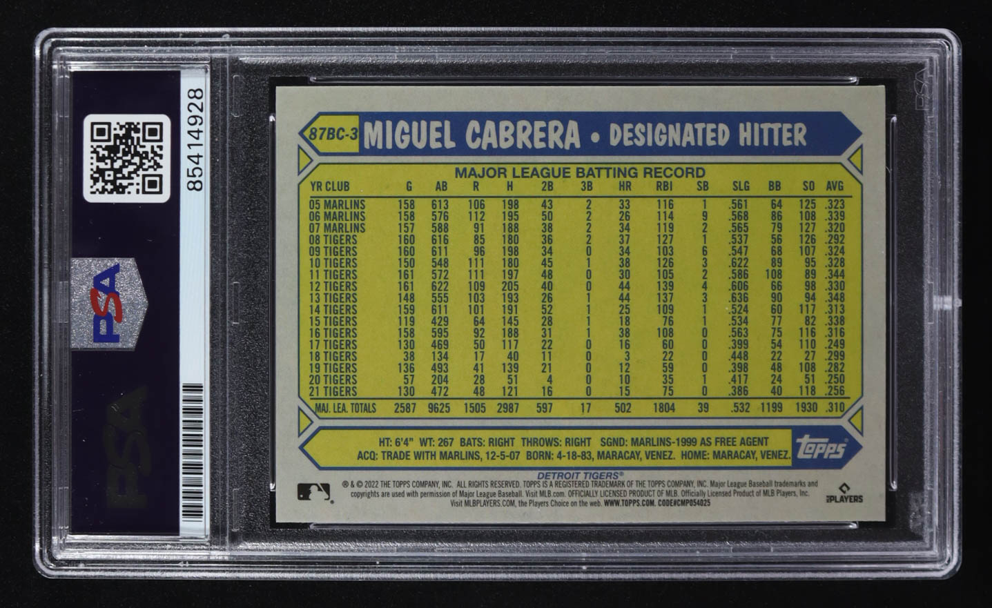 Miguel Cabrera Signed 2022 Topps Chrome '87 Topps #87BC3 (PSA)