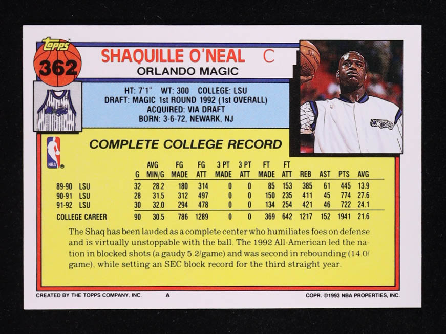 Shaquille O'Neal 1992-93 Topps #362 RC