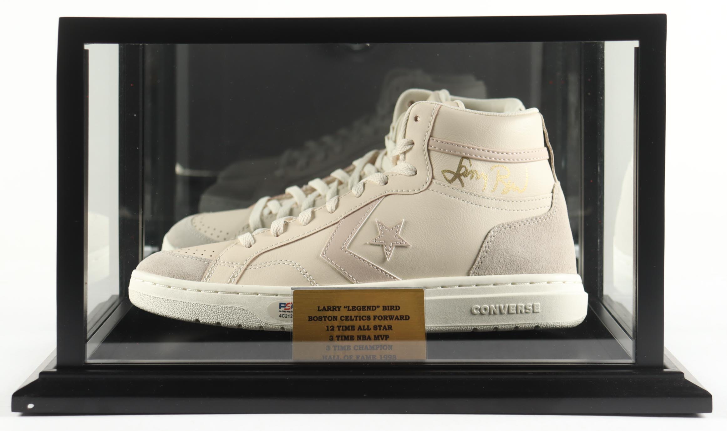 Larry Bird Signed Converse Basketball Shoe with Display Case & Stat Plaque (PSA)