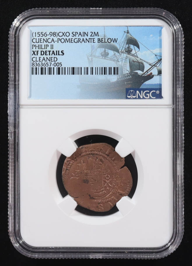Philip II (1556-1598) Colonial Era Spain 2 Maravedis Copper Coin (NGC XF Details)