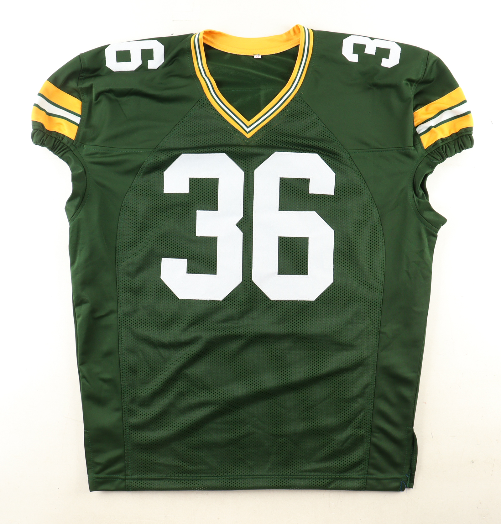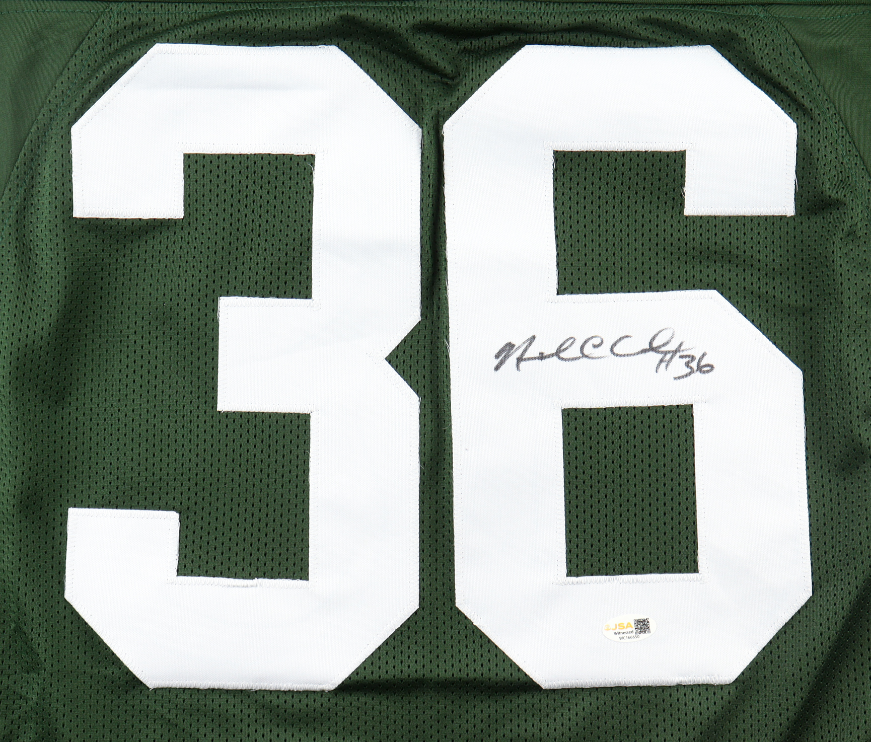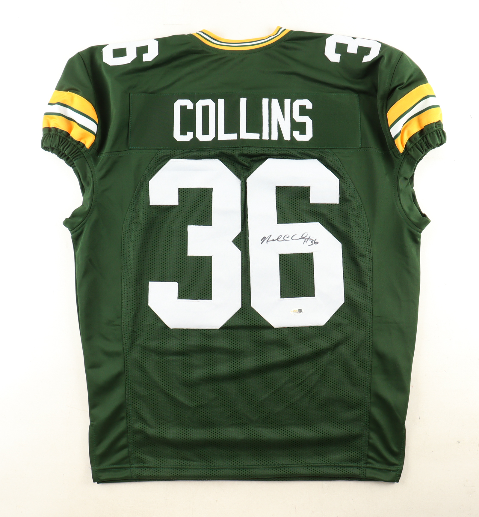 Custom jersey with everything is sewn on, size XL. Hand-signed by Nick Collins.