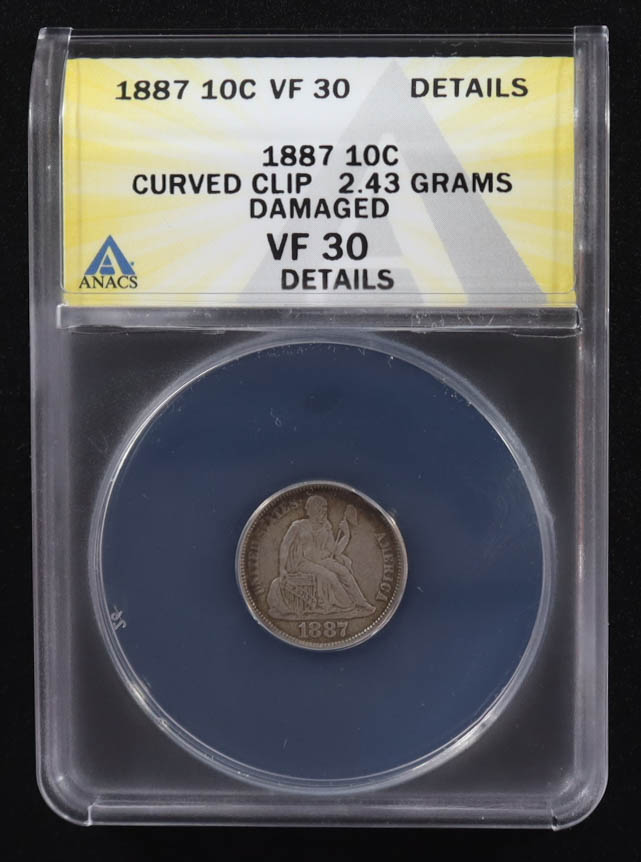 Mint Error 1887 Seated Liberty Dime Curved Clip 2.43 Grams (ANACS VF30 Details)