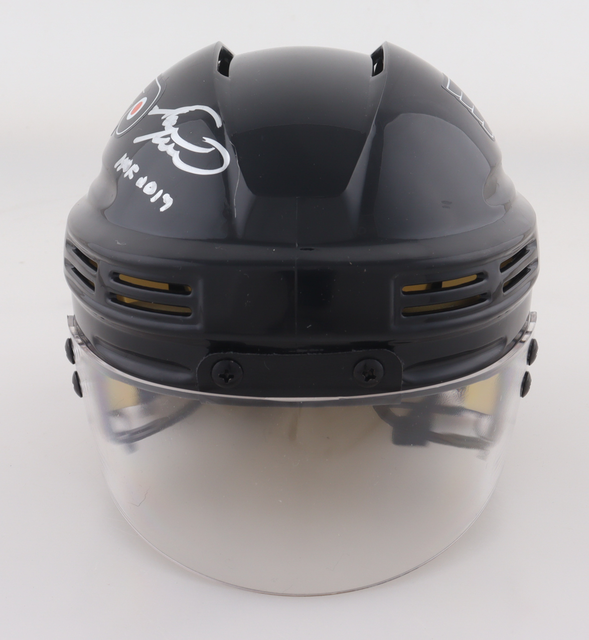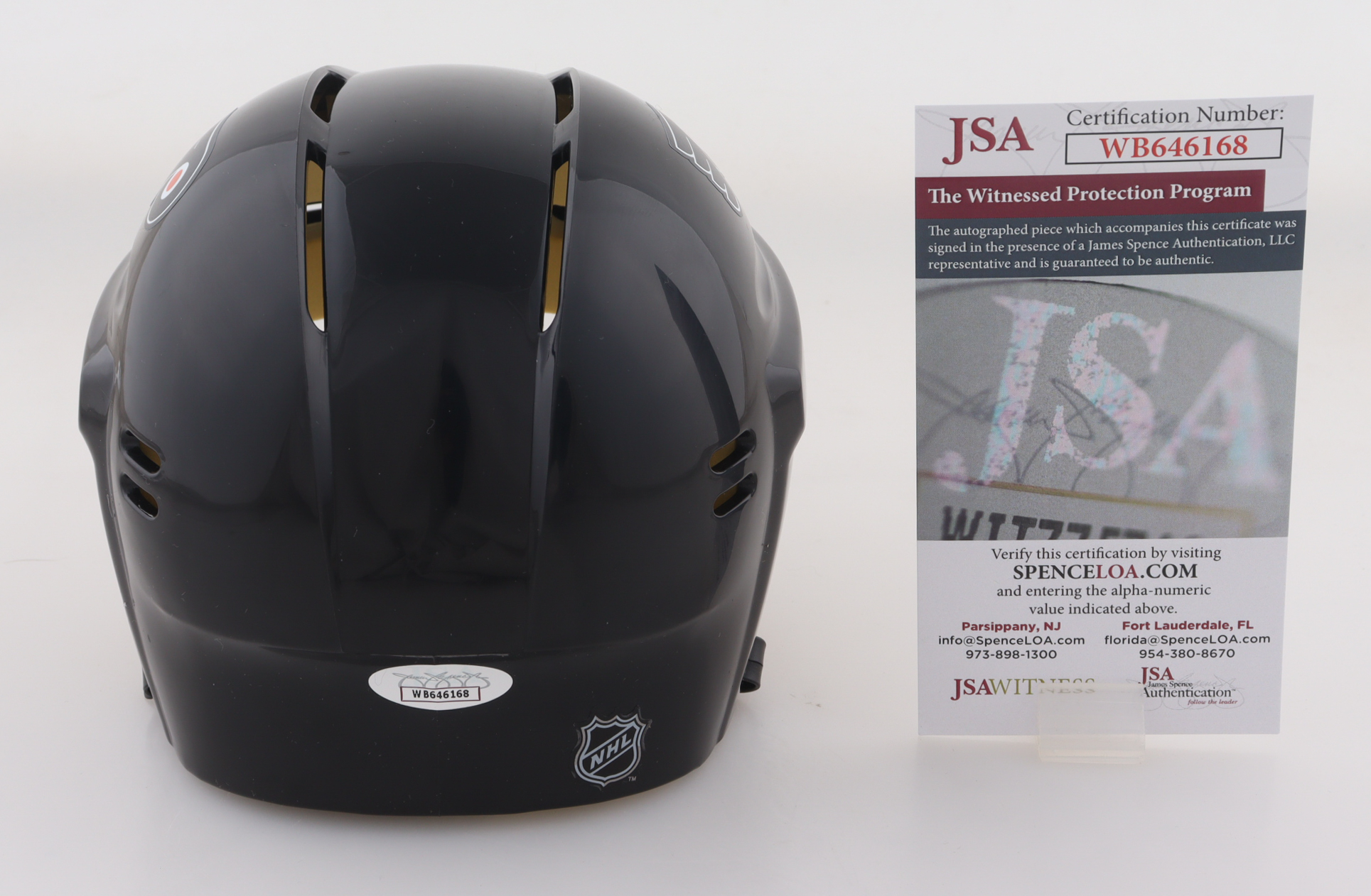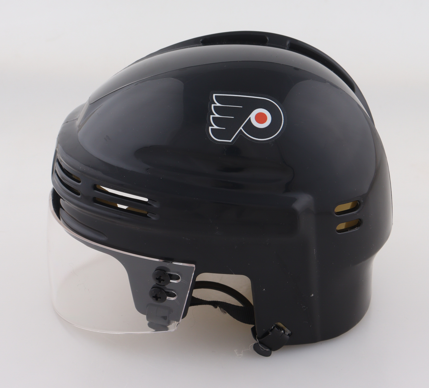 Philadelphia Flyers mini helmet has been hand-signed and inscribed by Mark Recchi (Philadelphia Flyers, HOF). Please note, the top of the packaging is damaged.
