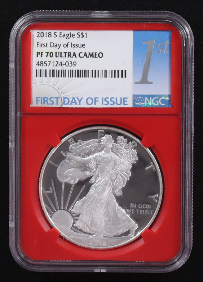 2018-S American Silver Eagle $1 Coin First Day of Issue Red Holder (NGC Proof 70 Ultra Cameo)