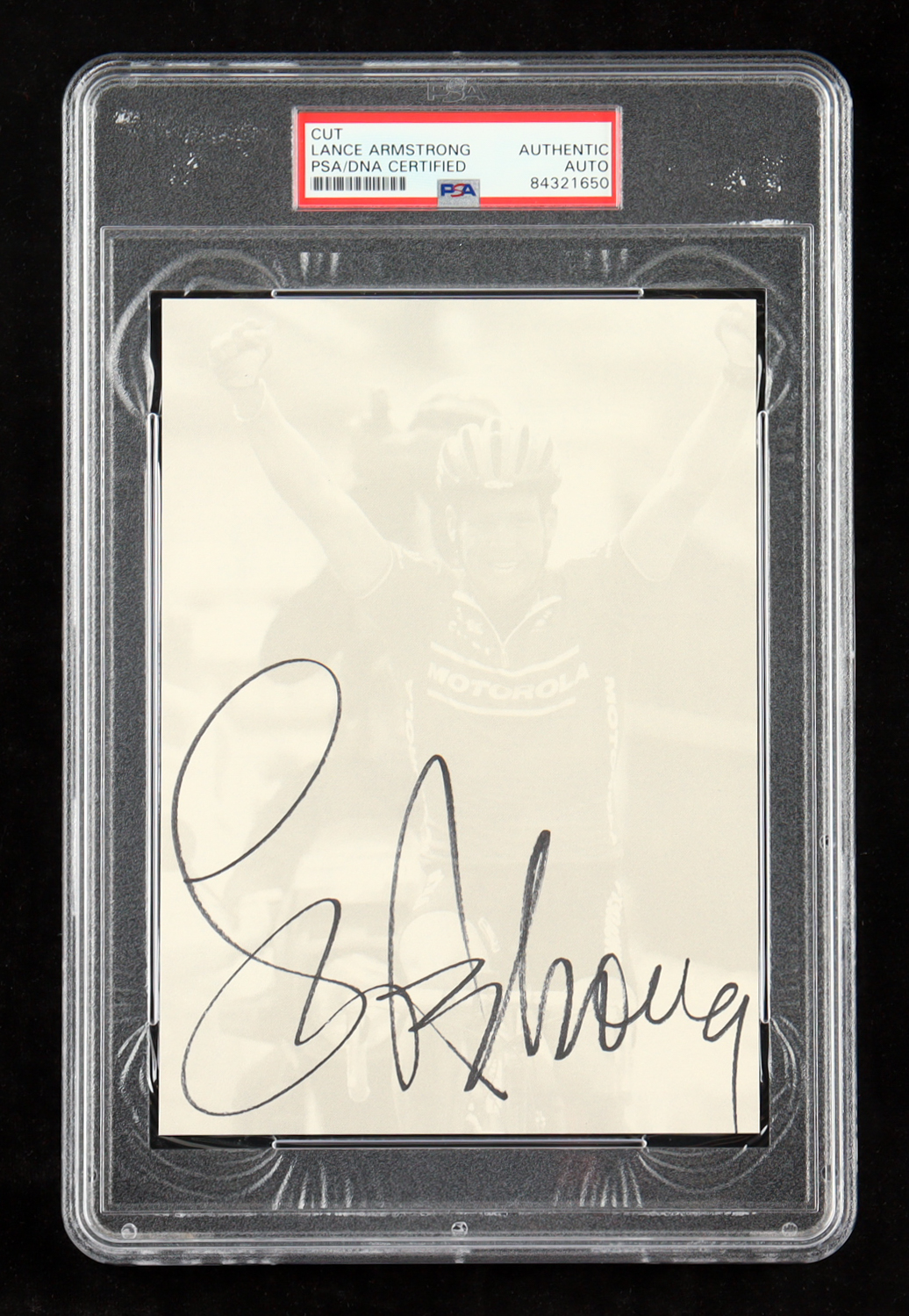 Cut measures 5" x 7" in size. Hand-signed by Lance Armstrong.