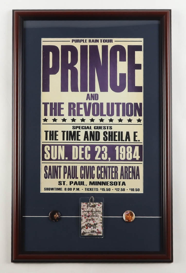 Prince & the Revolution "Purple Rain Tour" Custom Framed Concert Poster Display with 1985 Backstage Pass & (2) Vintage Prince Concert Pins