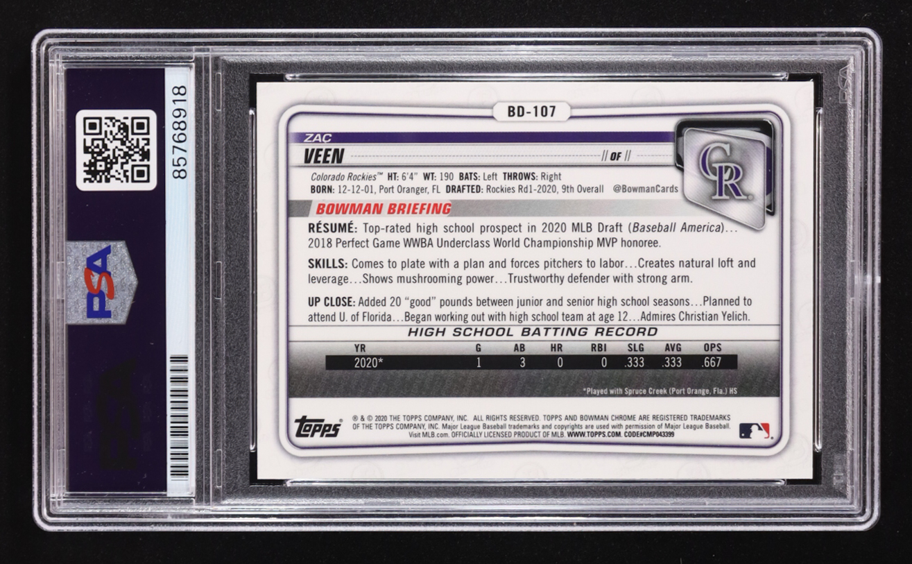Zac Veen Signed 2020 Bowman Chrome Sapphire #BD-107 RC (PSA)