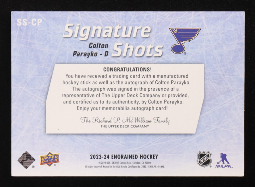 Colton Parayko 2023-24 Upper Deck Engrained Signature Shots #SSCP #69/99