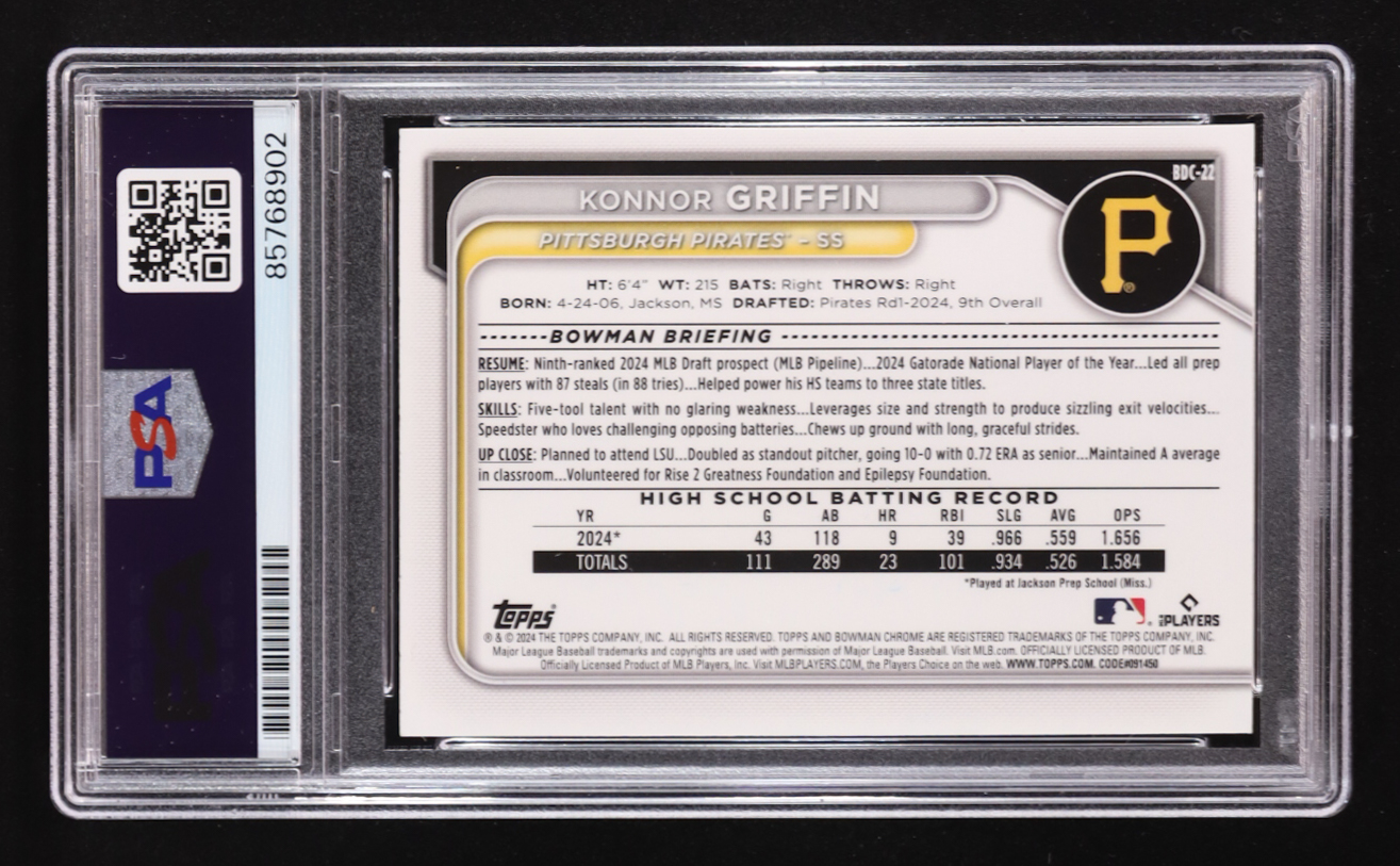 Konnor Griffin Signed 2024 Bowman Chrome #BDC-22 RC (PSA | Autograph Graded PSA 10)