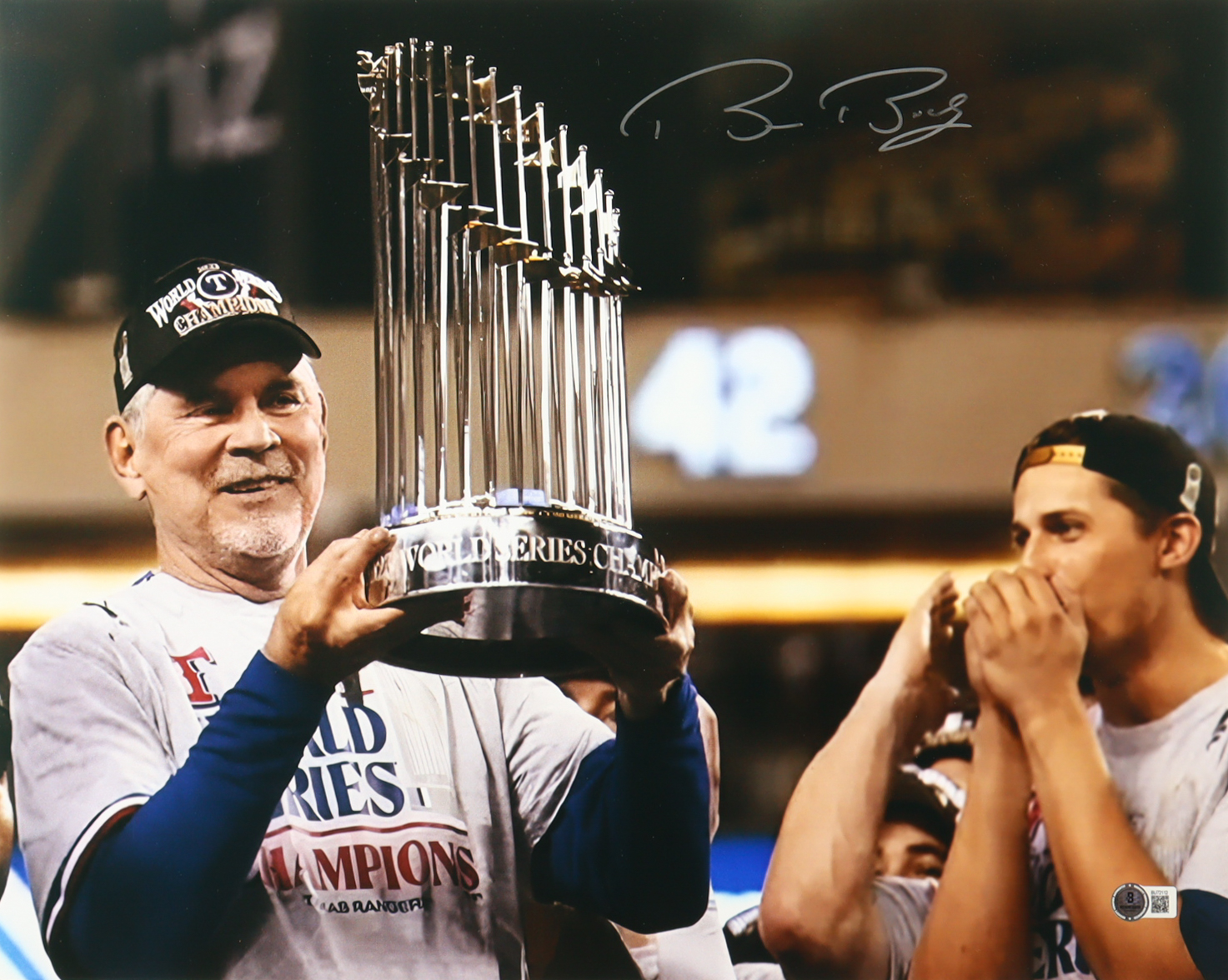 Photo measures 16" x 20" in size and has been hand-signed by Bruce Bochy (Texas Rangers).