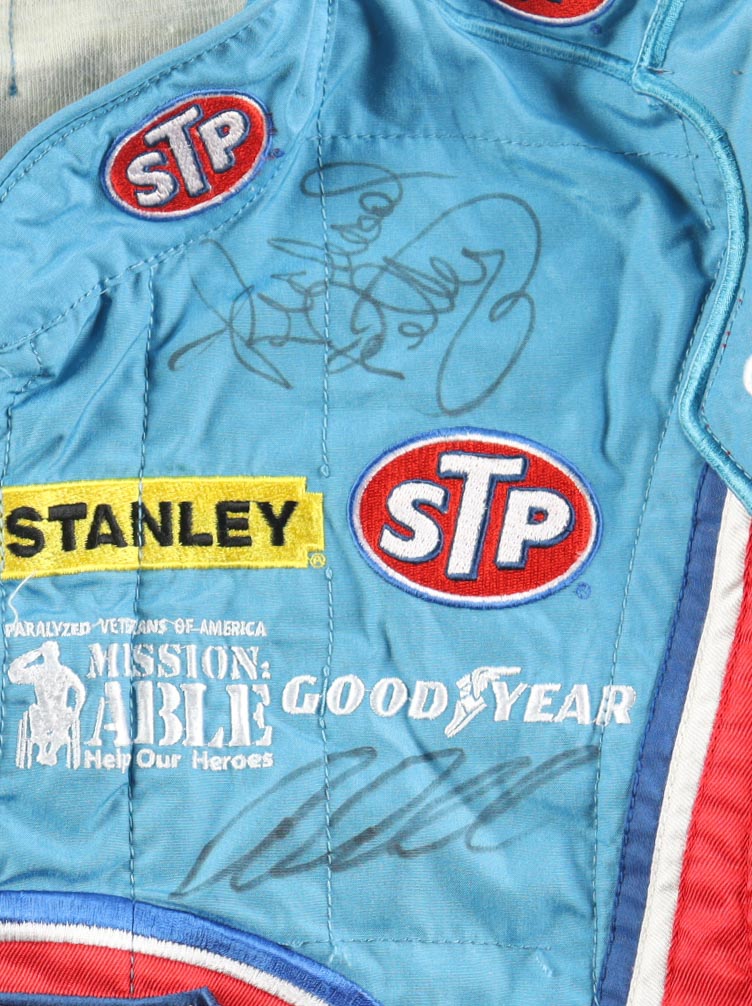 STP full-size racing suit has been hand-signed by Richard Petty (HOF) & Aric Almirola