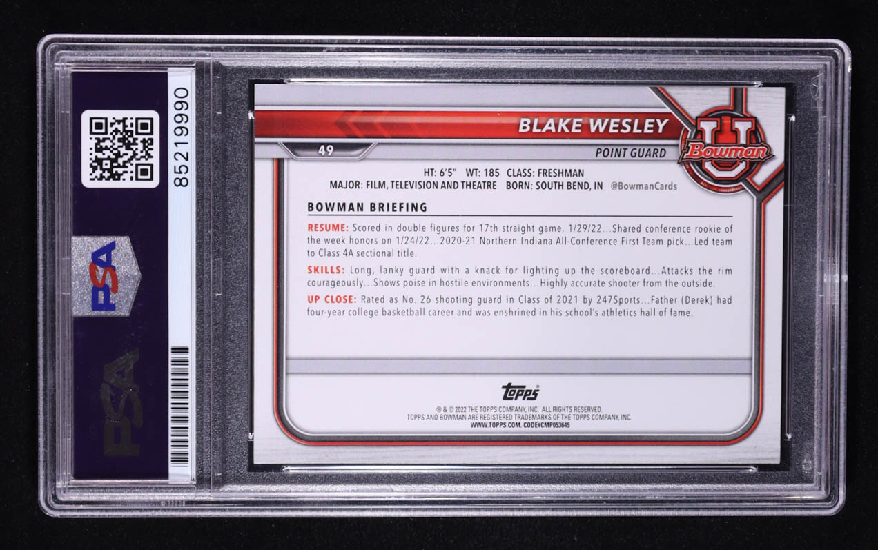 Blake Wesley Signed 2021-22 Bowman Chrome University #49 (PSA Encapsulated)