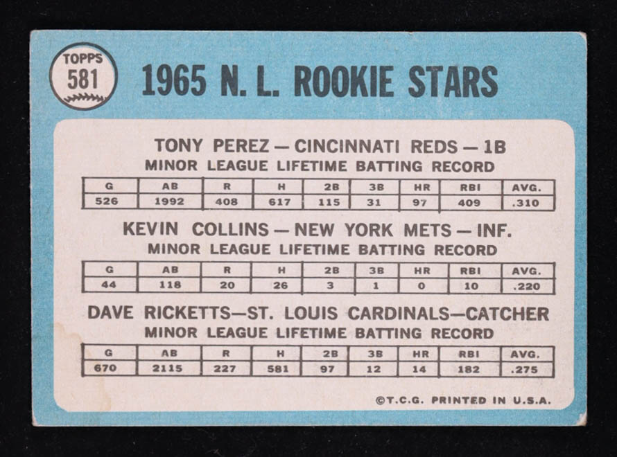 Tony Perez RC / Dave Ricketts RC / Kevin Collins 1965 Topps Rookie Stars SP #581 RC