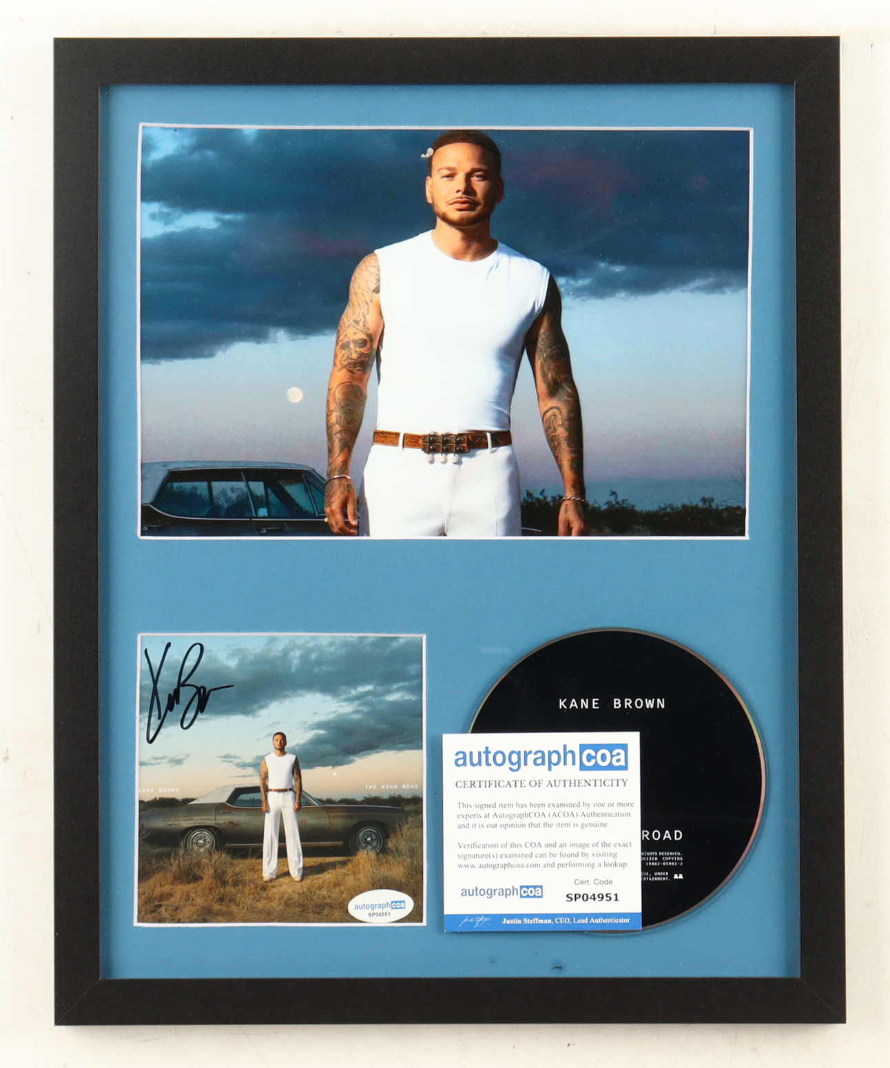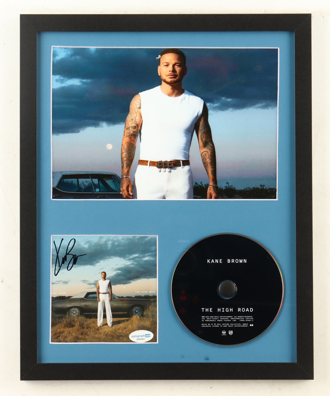 Custom frame measures approximately 12" x 15" in size. Features a "The High Road" CD insert that has been hand-signed by Kane Brown and includes the disc as shown.
