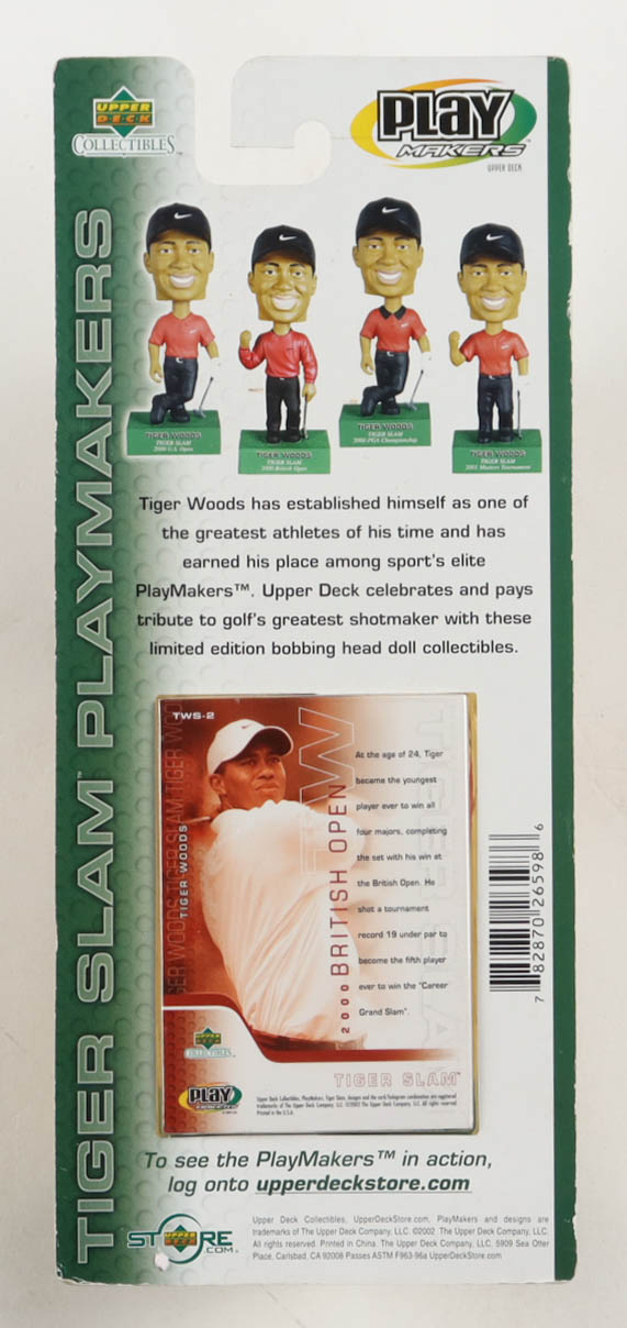 Upper Deck Playmakers Tiger Woods Special Edition Bobblehead comes factory sealed in original packaging as shown. Upper Deck trading card is included with figure. Please note, the bobble head is unsigned and there is scuffing on the packaging.