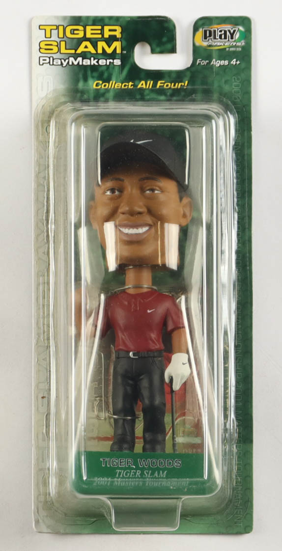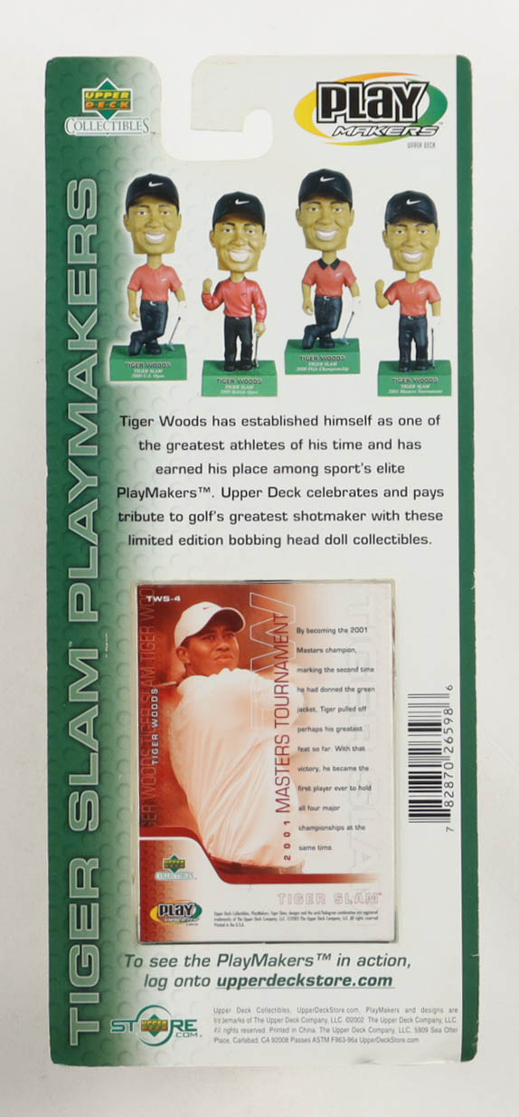 Upper Deck Playmakers Tiger Woods Special Edition Bobblehead comes factory sealed in original packaging as shown. Upper Deck trading card is included with figure. Please note, the bobble head is unsigned and there is scuffing on the packaging.