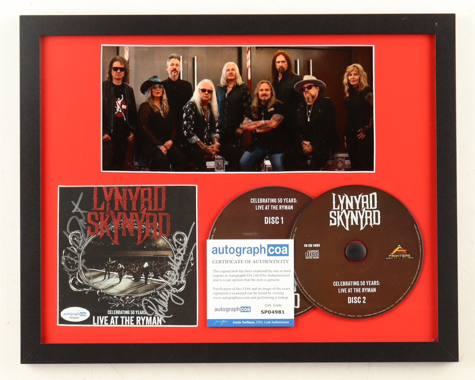 Custom frame measures approximately 12" x 15" in size. Features a "Celebrating 50 Years - Live at the Ryman" CD insert that has been hand-signed by Johnny Van Zant and Rickey Medlocke. Both discs are included as shown.