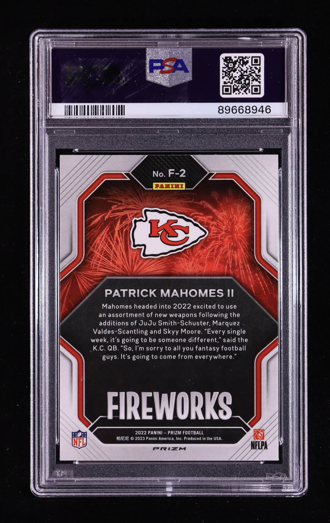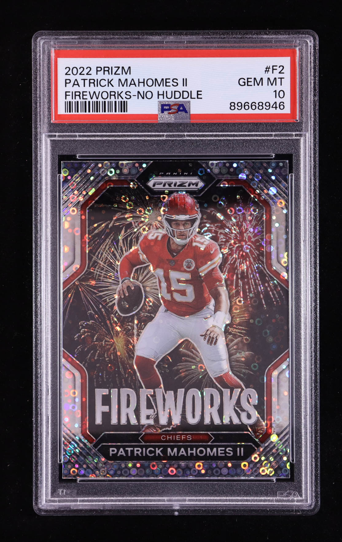 Patrick Mahomes II 2022 Panini Prizm Fireworks Prizms No Huddle #2 (PSA 10)