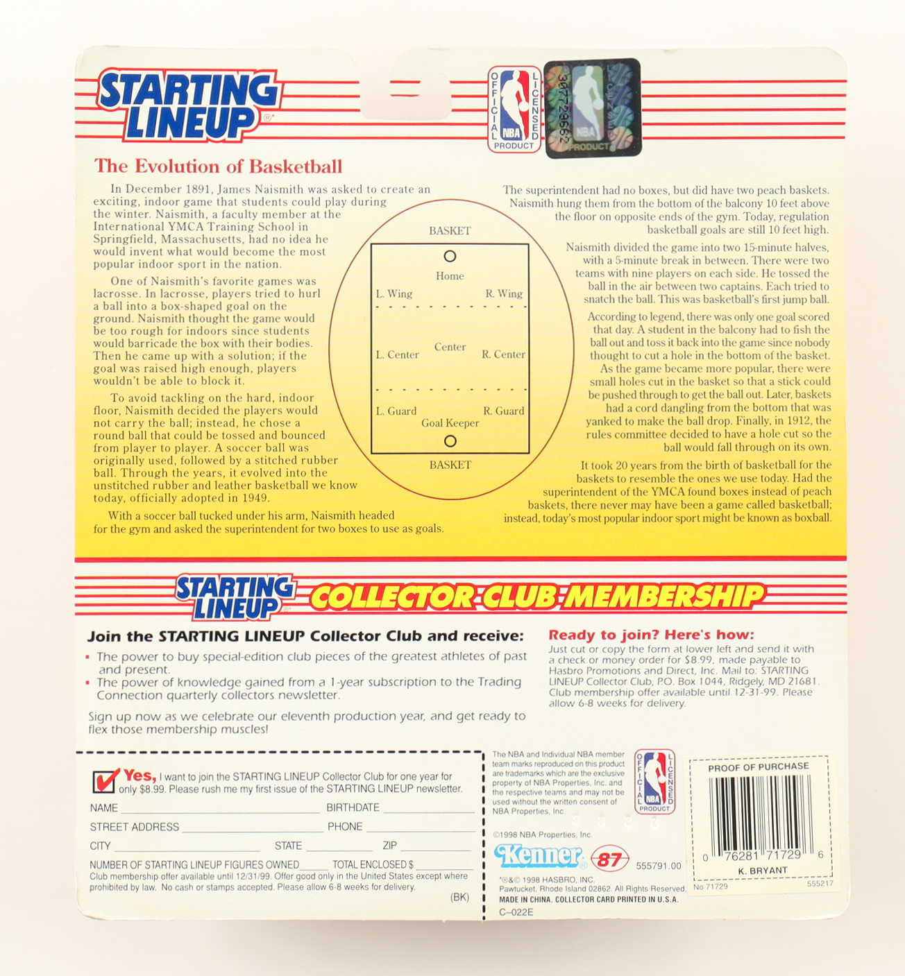 Kobe Bryant 1998 Starting Lineup Basketball Action Figure with Trading Card