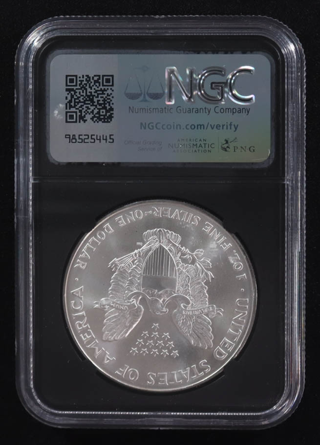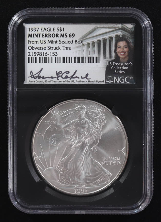Mint Error 1997 American Silver Eagle $1 Coin Obverse Struck Thru Black Core Holder - Anna Escobedo Cabral Signed Label (NGC MS69)