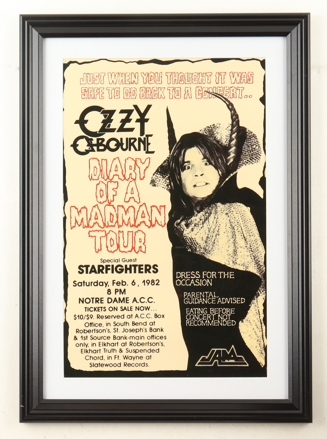 Custom frame measures approximately 15" x 21" in size and features a 1982 "Ozzy Osbourne" Notre Dame Concert Poster. Please note, the display is unsigned and there is minor scuffing throughout the frame.