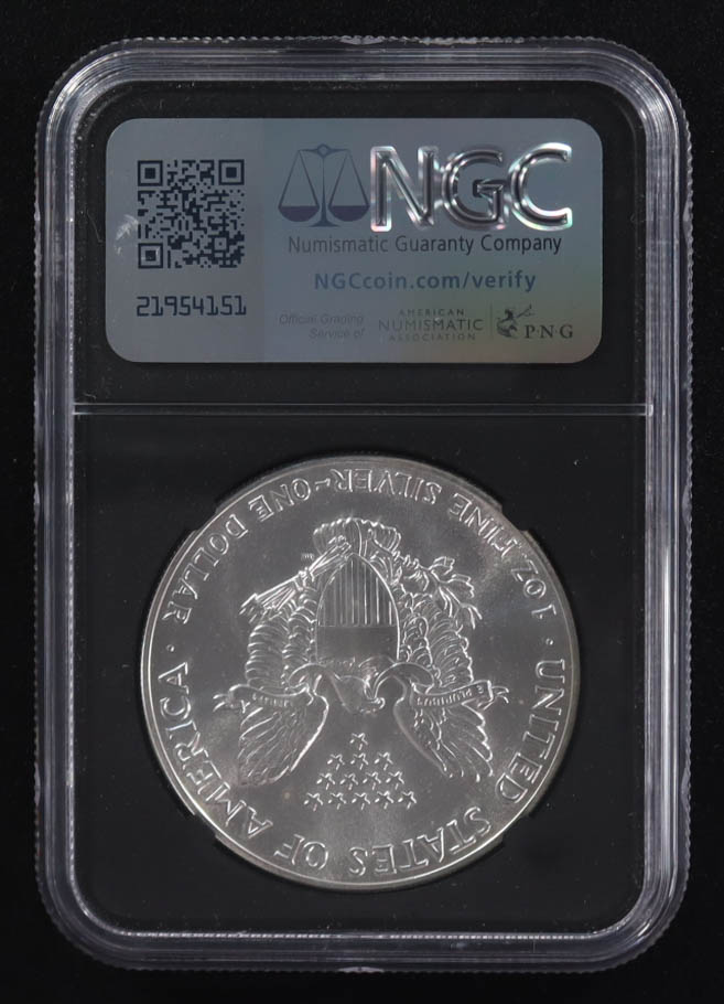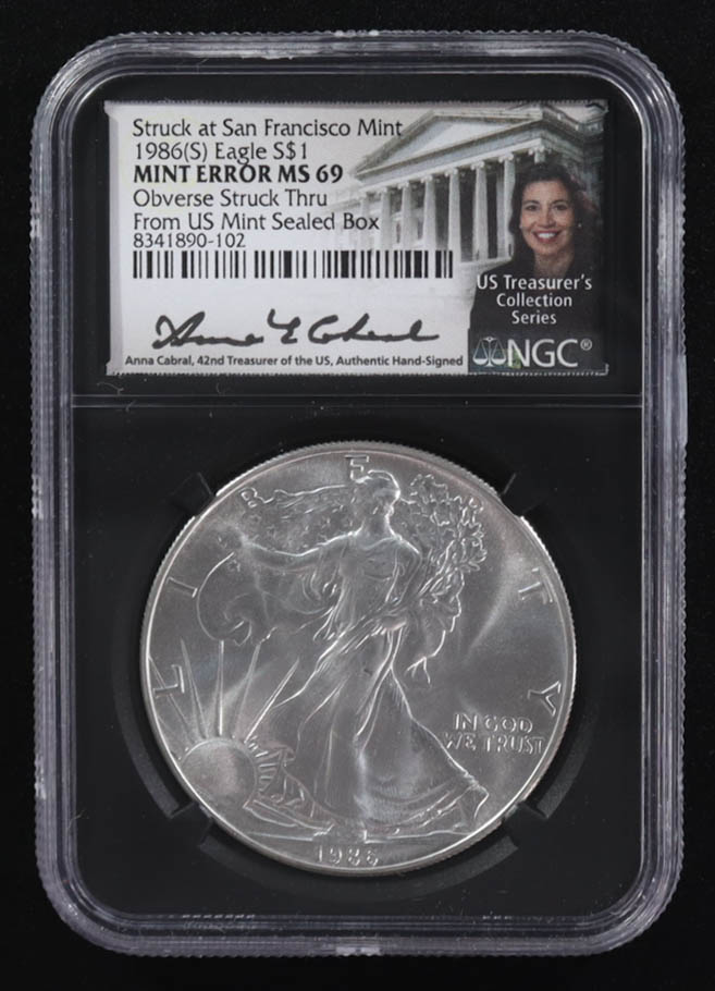 Mint Error 1986-(S) American Silver Eagle $1 Coin Struck at San Francisco Obverse Struck Thru Black Core Holder - Anna Escobedo Cabral Signed Label (NGC MS69)
