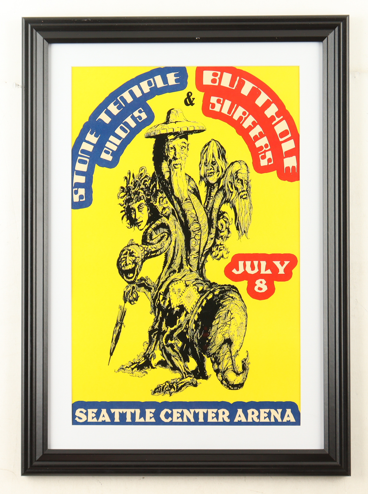 Custom frame measures approximately 15" x 21" in size and features a 1993 "Stone Temple Pilots & Butthole Surfers" Seattle Concert Poster. Please note, the display is unsigned and there is minor scuffing throughout the frame.