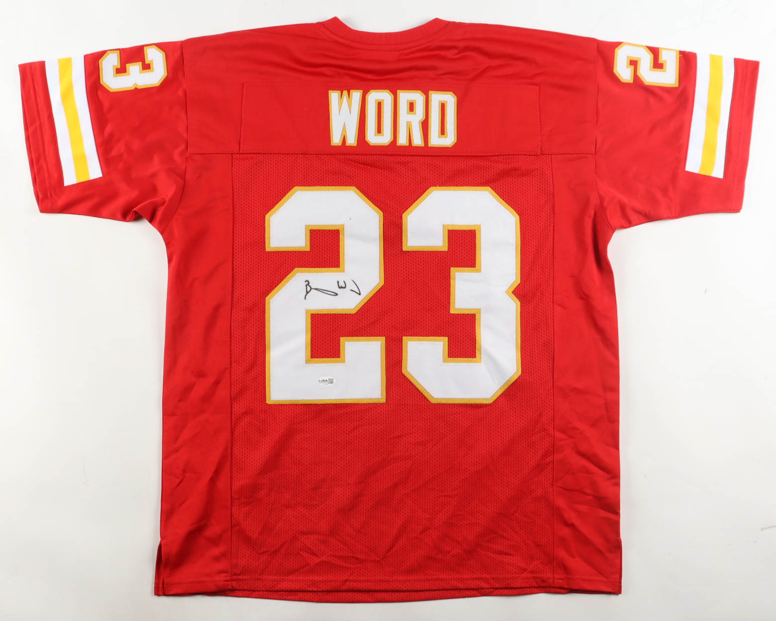 Custom jersey with everything sewn on, size XL. Hand-signed by Barry Word. Please note, the signature has bled.